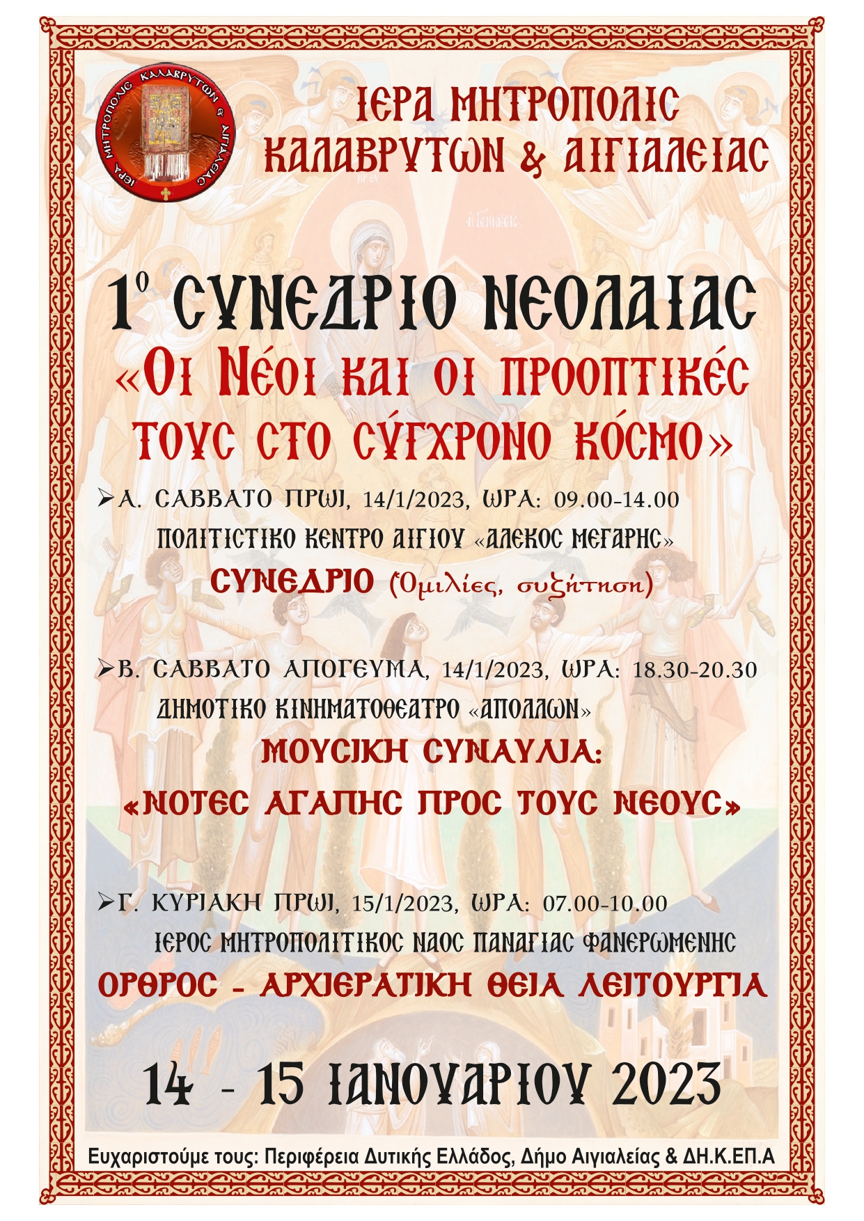 Η Ιερά Μητρόπολη Καλαβρύτων και Αιγιαλείας, στο πλαίσιο της ποιμαντικής και πατρικής μέριμνας του Σεβασμιωτάτου Μητροπολίτου κ. Ιερωνύμου και με διάθεση ουσιαστικής επικοινωνίας, ειλικρινούς διαλόγου και συμπροβληματισμού με τους νέους μας, οργανώνει το 1ο Συνέδριο για Νέους, με θεματικό τίτλο: «Οι Νέοι και οι προοπτικές τους στον σύγχρονο κόσμο».