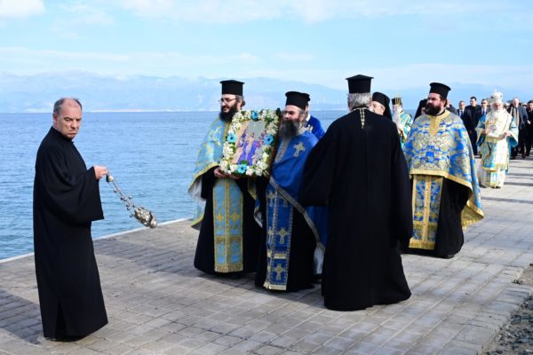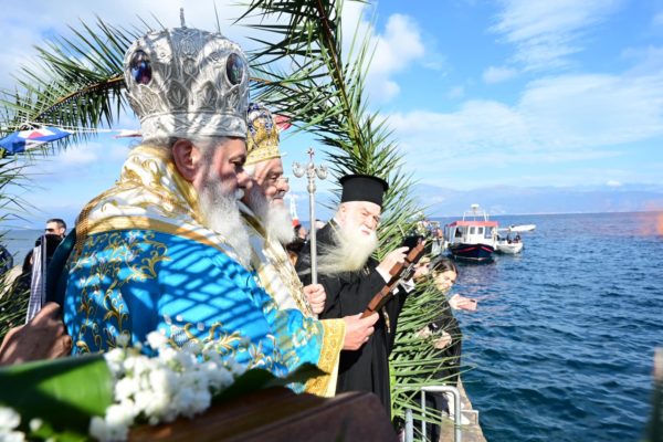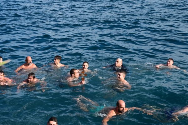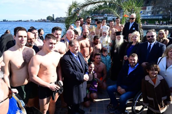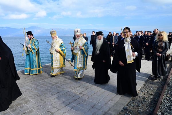 Μετά το πέρας της Θείας Λειτουργίας κλήρος και λαός κατευθύνθηκαν στον Λιμένα Αιγίου όπου τελέστηκε ο αγιασμός των υδάτων και η ρίψη του Τιμίου Σταυρού παρουσία πλήθος λαού. Περισσότεροι από δέκα νέοι βούτηξαν στο νερό για να πιάσουν τον Σταυρό και να λάβουν την Ευλογία. Στο Λιμάνι του Αιγίου παρευρέθηκε και ο Βουλευτής του κόμματος ΝΙΚΗ κ. Τσιρώνη Σπυρίδωνας.