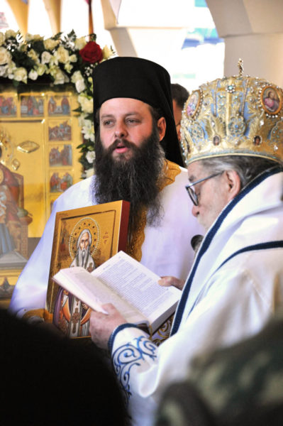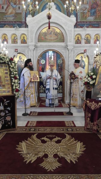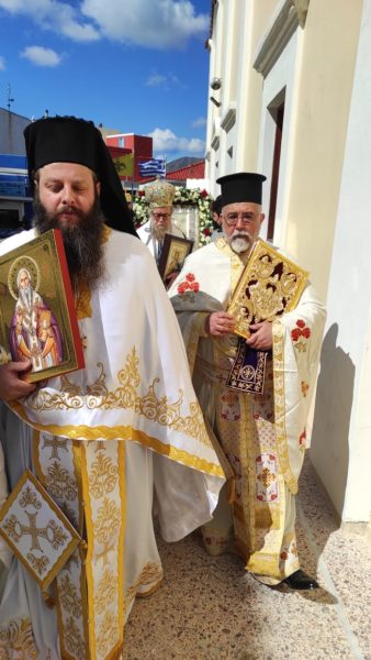 Ο προϊστάμενος του Ιερού Ναού Ευαγγελιστρίας πόλεως Καρπάθου Αρχιμανδρίτης Αμβρόσιος Μαναρουλάς, ευχαρίστησε τον Ποιμενάρχη για την παρουσία του και την Ιερουργία του στον Ιερό Ναό και του προσέφερε ένα αντίγραφο της εικόνος του Αγίου Αμβροσίου Επισκόπου Μεδιολάνων, που προσφάτως αγιογραφήθηκε και τοποθετήθηκε σε προσκυνητάρι στην είσοδο του Ιερού Ναού.