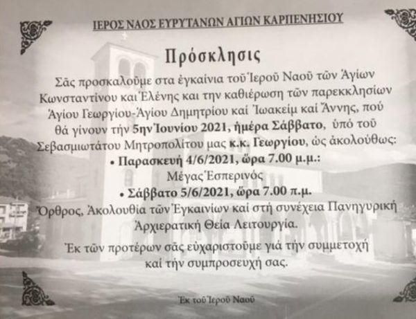 Ο Σεβασμιώτατος Μητροπολίτης Καρπενησίου κ. Γεώργιος θα εγκαινιάσει τον Ιερό Ναό Αγίων Κωνσταντίνου και Ελένης και θα καθιερώσει τα παρεκκλήσια των Αγίου Γεωργίου-Αγίου Δημητρίου και Ιωακείμ και Άννης του Ιερού Ναού Ευρυτάνων Αγίων, το Σάββατο 5 Ιουνίου, κατά το ακόλουθο πρόγραμμα: