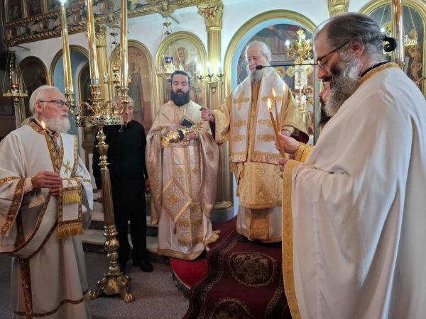 Με τον Σεβασμιώτατο Μητροπολίτη κ. Σεραφείμ συλλειτουργησαν ο Πρωτοσύγκελλος της Ιεράς Μητροπόλεως Πανοσ Αρχίμ Νικόδημος Πόγκας ο Πανοσ Αρχιμ Αντώνιος Αγγελόπουλος ο Πρεσβύτερος Θεόδωρος Σπαγγούρος εφημέριος του ιερού ναού και ο Διάκονος Ιώαννης Τσάκλανος.