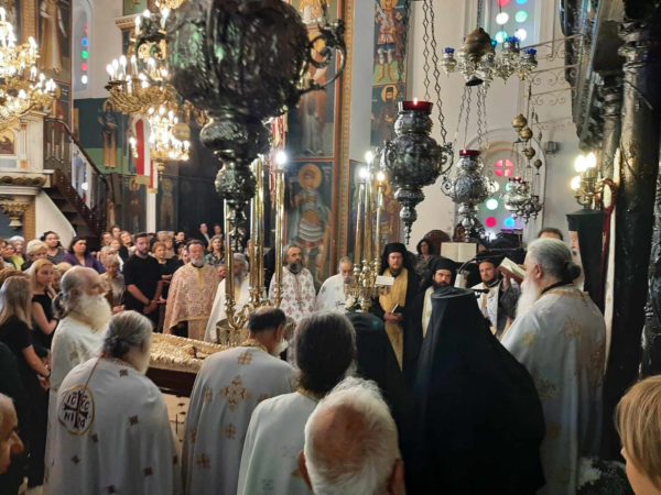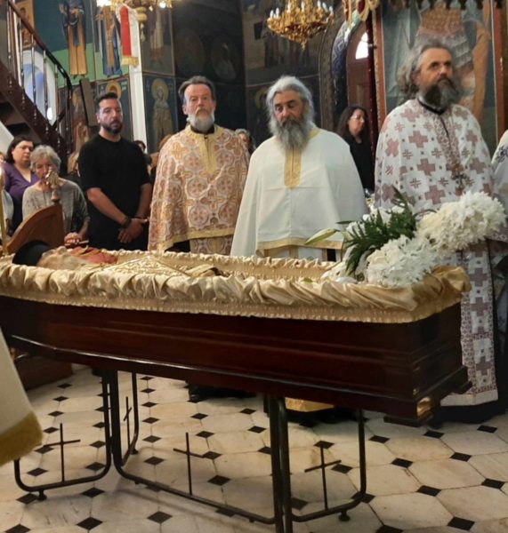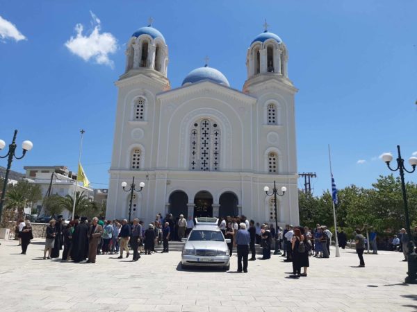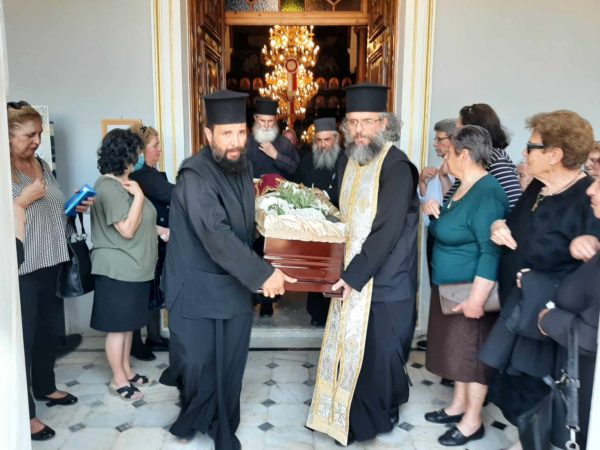 Την επομένη ημέρα στην εξόδιο ακολουθία προέστη ο Σεβασμιώτατος Μητροπολίτης Καρυστίας και Σκύρου κ. Σεραφείμ με τον εκ Στύρων Σεβασμιώτατο Μητροπολίτη Ειρηνουπόλεως κ. Νίκανδρο συμπαραστούμενοι από τον Πρωτοσύγκελλο Πανοσ. Αρχιμανδρίτη Νικόδημο Πόγκα τον Γενικό Αρχιερατικό Επίτροπο Πρωτοπρεσβύτερο Ελευθέριο Σταμπέλο τον Αρχιερατικό Επίτροπο Καρύστου Πανοσ. Αρχιμανδρίτη Γεράσιμο Παρίση συμμετοχή ιερέων από τις επαρχίες Καρύστου Αλιβερίου την Αθήνα και τον Διάκονο Στυλιανό Πεταχτή.