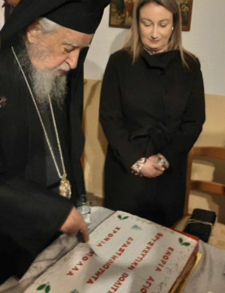 Μετά το πέρας του εόρτιου εσπερινού στο πνευματικό κέντρο του ιερού ναού ο Σεβασμιώτατος Μητροπολίτης κ. Σεραφείμ ευλόγησε την αγιοβασιλειόπιτα της ενορίας απευθύνοντας τις πατρικές και εόρτιες ευχές του.