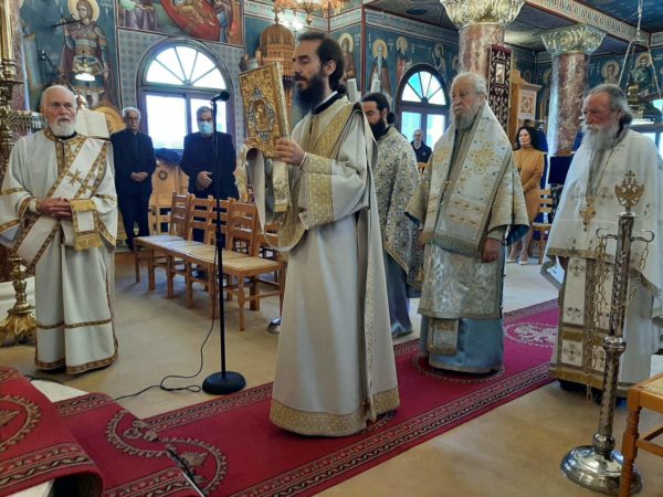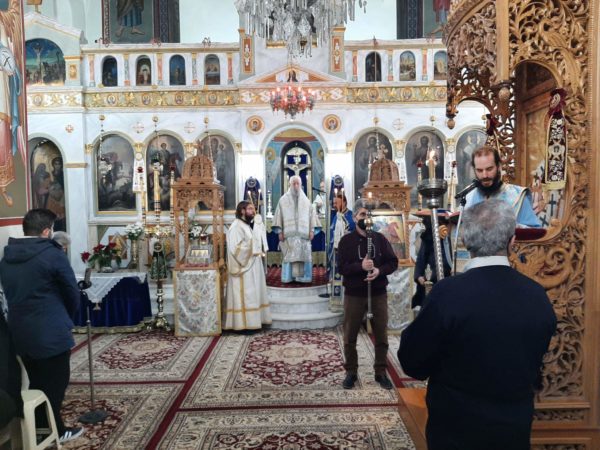 Ο Σεβασμιώτατος προεξήρχε της Αρχιερατικής Θείας Λειτουργίας πλαισιούμενος από τους Πανοσιολογιώτατο Αρχιμανδρίτη Νικόδημο Τσιμόγιαννη εφημέριο Ιερού Ναού Αγίου Γεωργίου Αλιβερίου και Ιερόκηρυξ της Ιεράς Μητροπόλεως τον Πανοσιολογιώτατο Αρχιμανδρίτη Νεκτάριο Καπενή τον Πρωτοπρεσβύτερο Γεώργιο Γιαννούλη εφημέριο Αγίου Λουκά,τους Οικονόμους Αριστείδη Ρούσσο, εφημέριο Διρρευμάτων π. Ευάγγελο Σκιάνη εφημέριο Αγίου Βλασίου, π. Αναστάσιο Γανωτή εφημέριο Νεοχωρίου, τον Πρωτοπρεσβύτερο Ευάγγελο Βογιατζή εφημέριο του ιερού ναού και τους Διακόνους Στυλιανό Πεταχτή και Απόστολο Μπάκουλη.