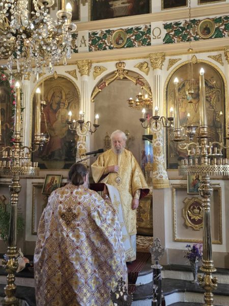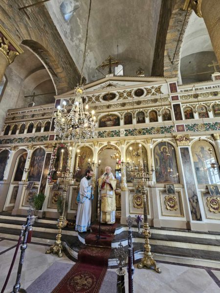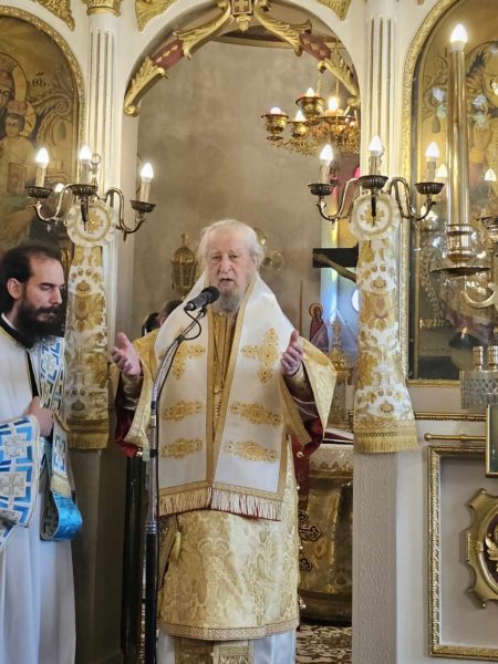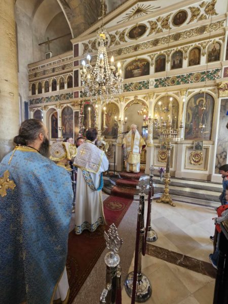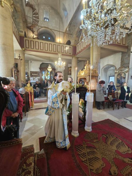 Εν συνεχεία ο Σεβασμιώτατος κ. Σεραφείμ τέλεσε την Αρχιερατική Θεία Λειτουργία με συλλειτουργούς τον Αρχιμανδρίτη Πρόδρομο Γκέγκε τον Οικονόμο Χρήστο Φραγκίσκο εφημέριο του ιερού ναού και τον Διάκονο Στυλιανό Πεταχτή.