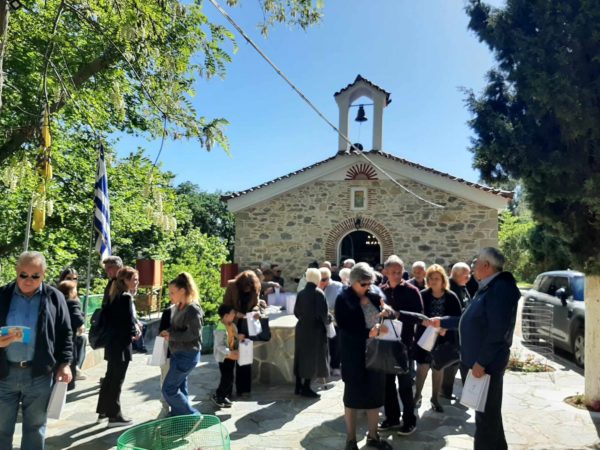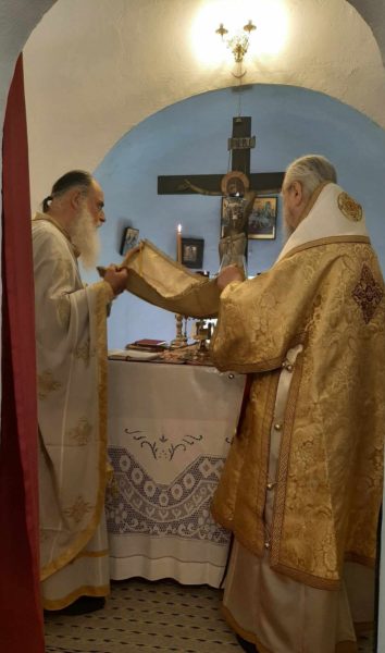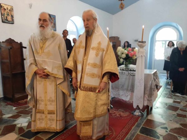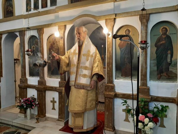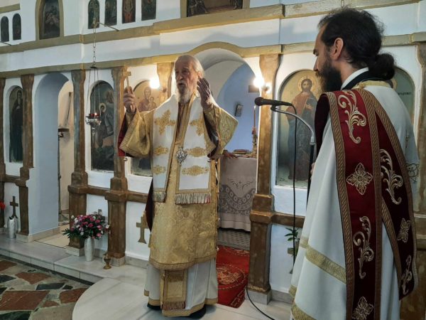 Ο Σεβασμιώτατος κ. Σεραφείμ τέλεσε την Αρχιερατική Θεία Λειτουργία στον εξωκλήσι του Αγίου Γεωργίου λόγω των πολλών εργασιών της ανακαινίσεως του ενοριακού ιερού ναού Κοιμήσεως της Θεοτόκου στον οικισμό του Λοφίσκου – Αυλωναρίου.