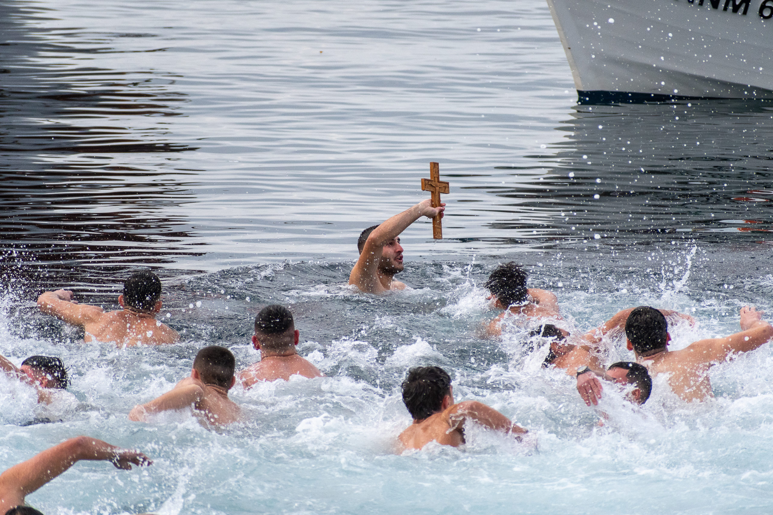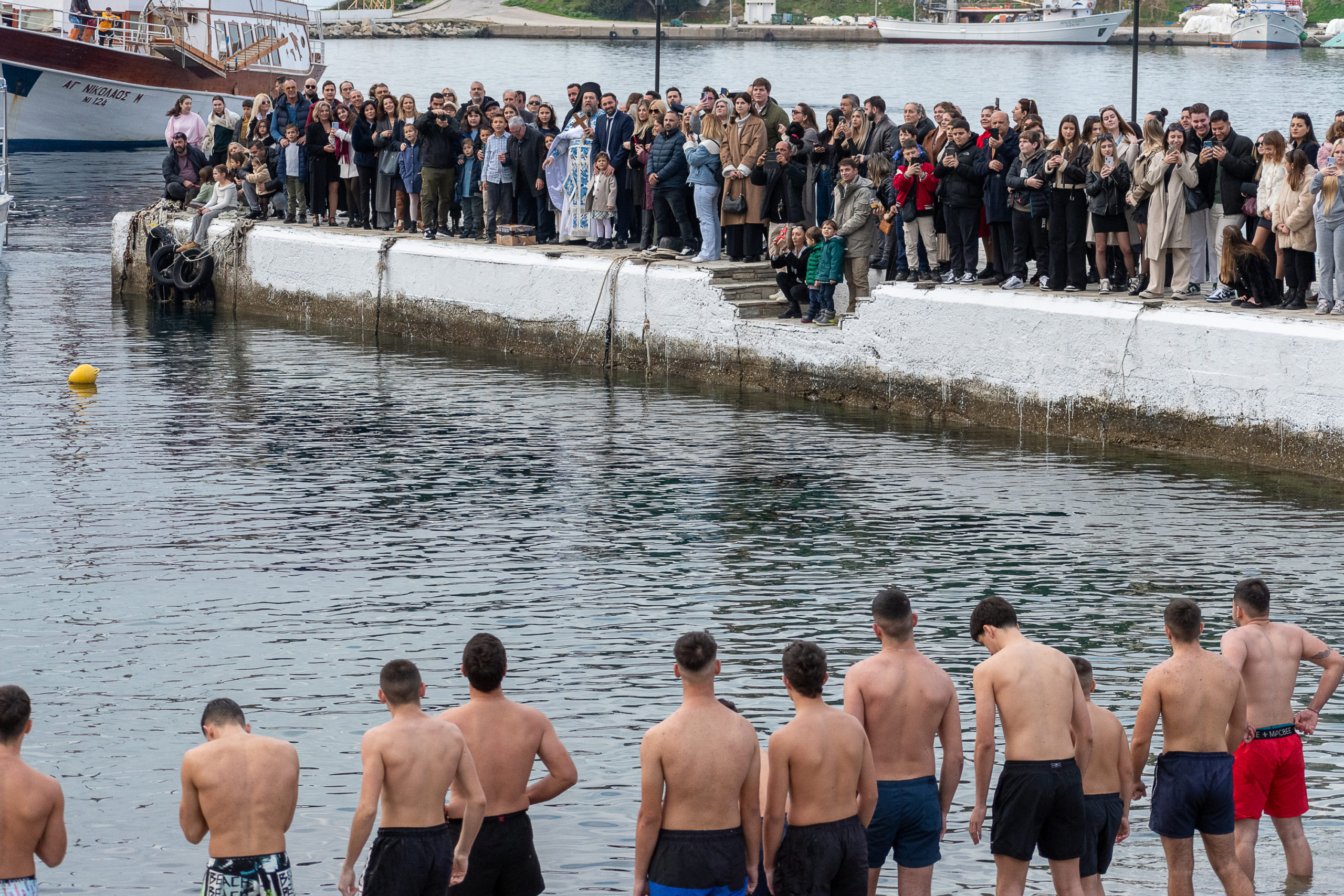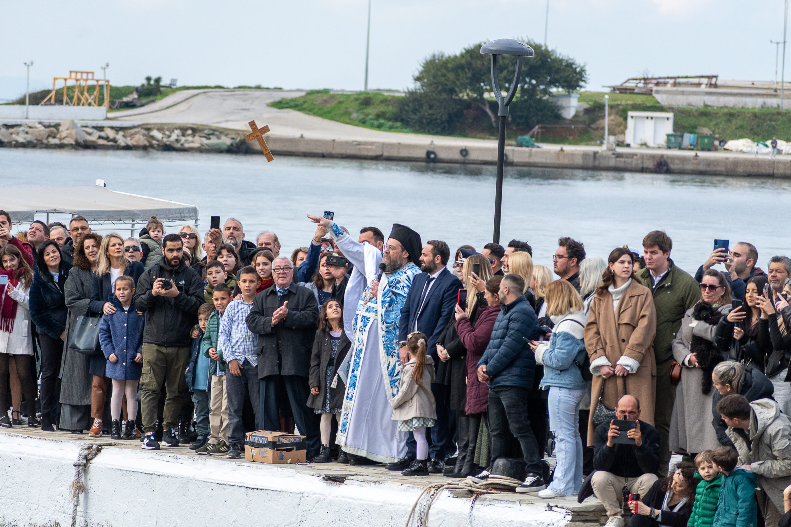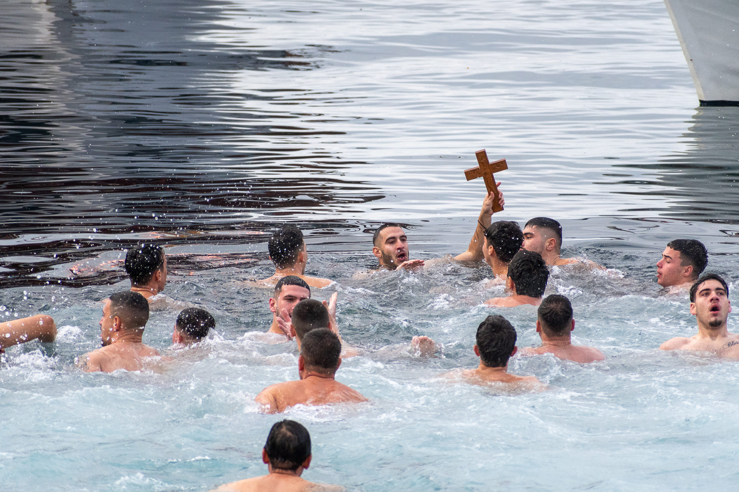 Ακολούθησε η λιτανεία, από τον ναό στην προβλήτα, όπου και έγινε ο Αγιασμός των Υδάτων. Περισσότεροι από 30 νέοι ήταν οι κολυμβητές που έπεσαν στα παγωμένα νερά αψηφώντας το κρύο, για να πιάσουν το ιερό σύμβολο της Ορθοδοξίας.