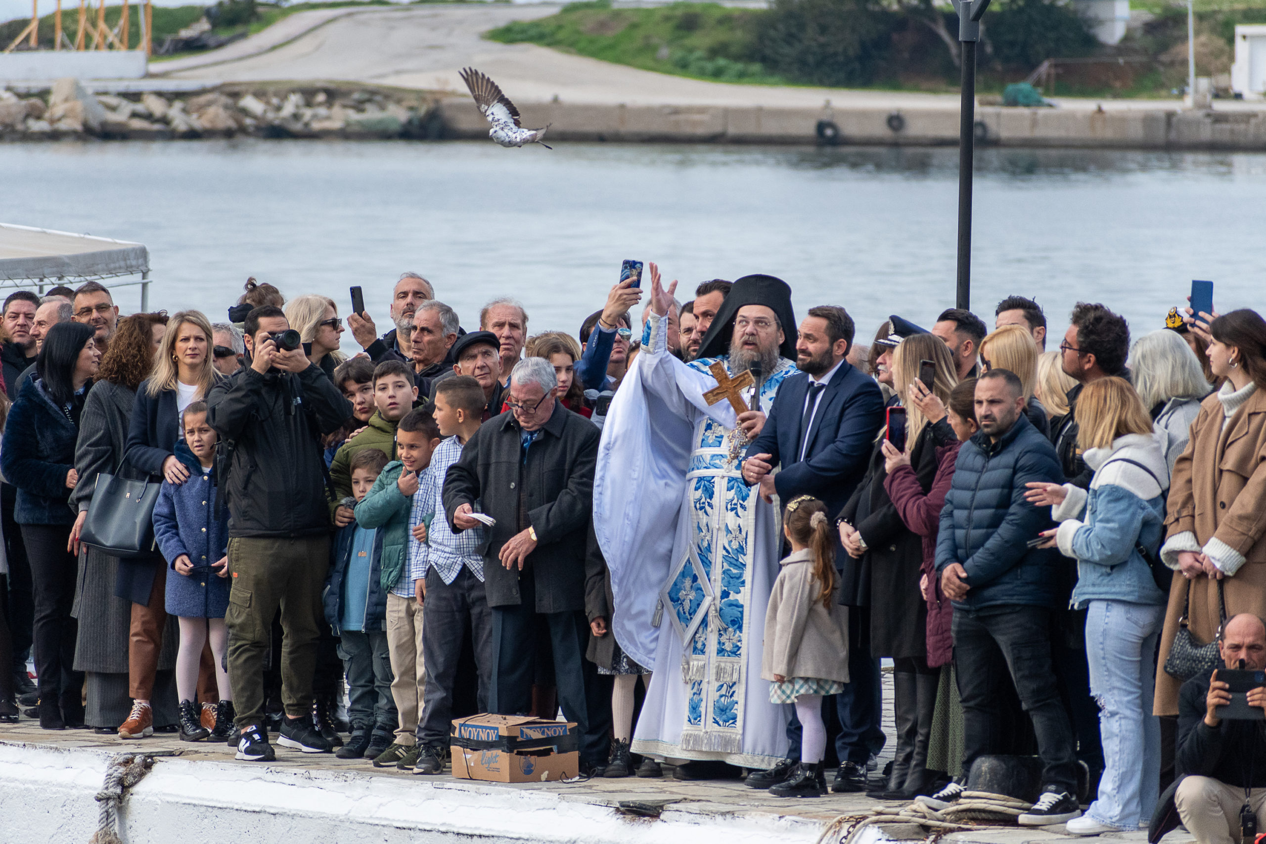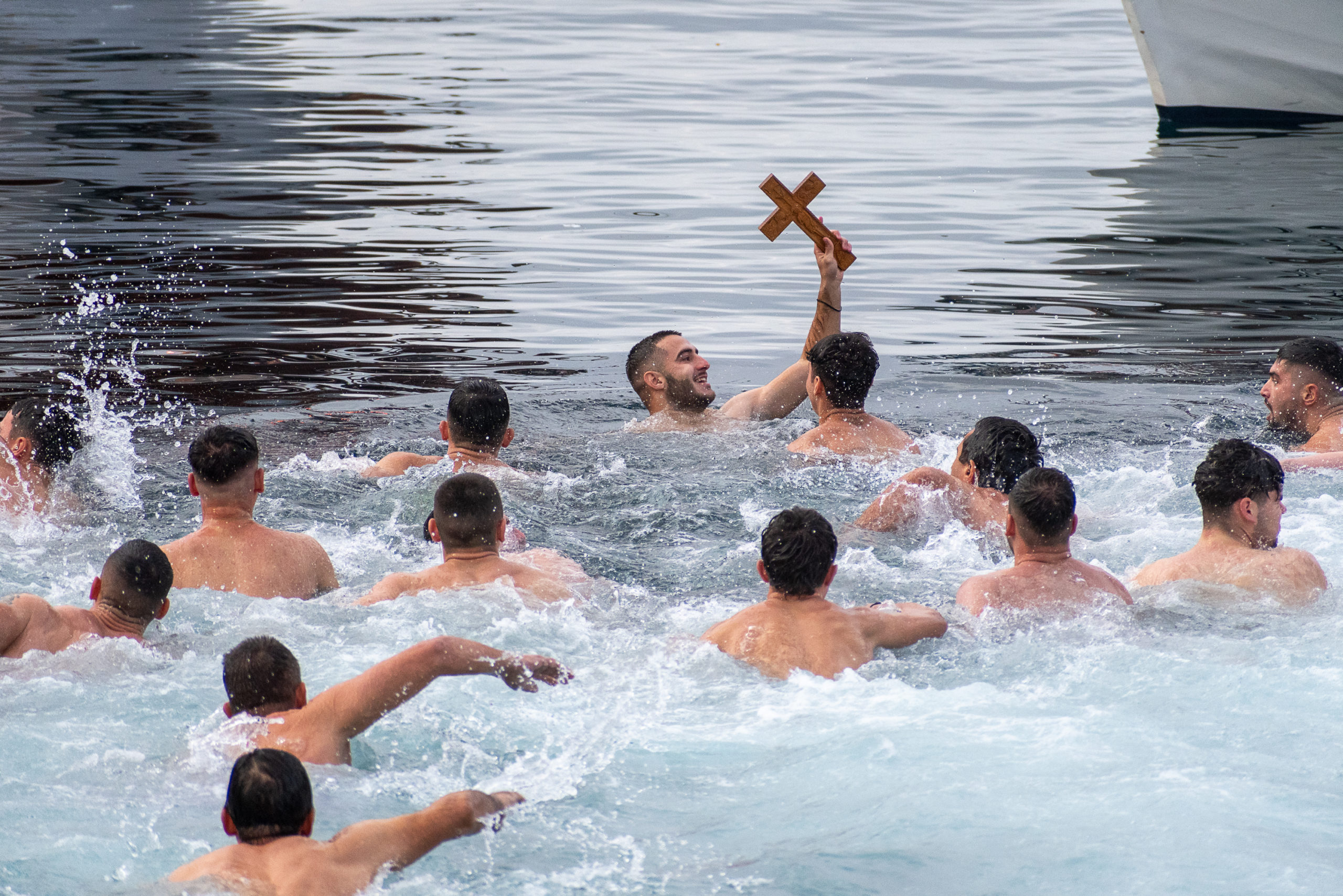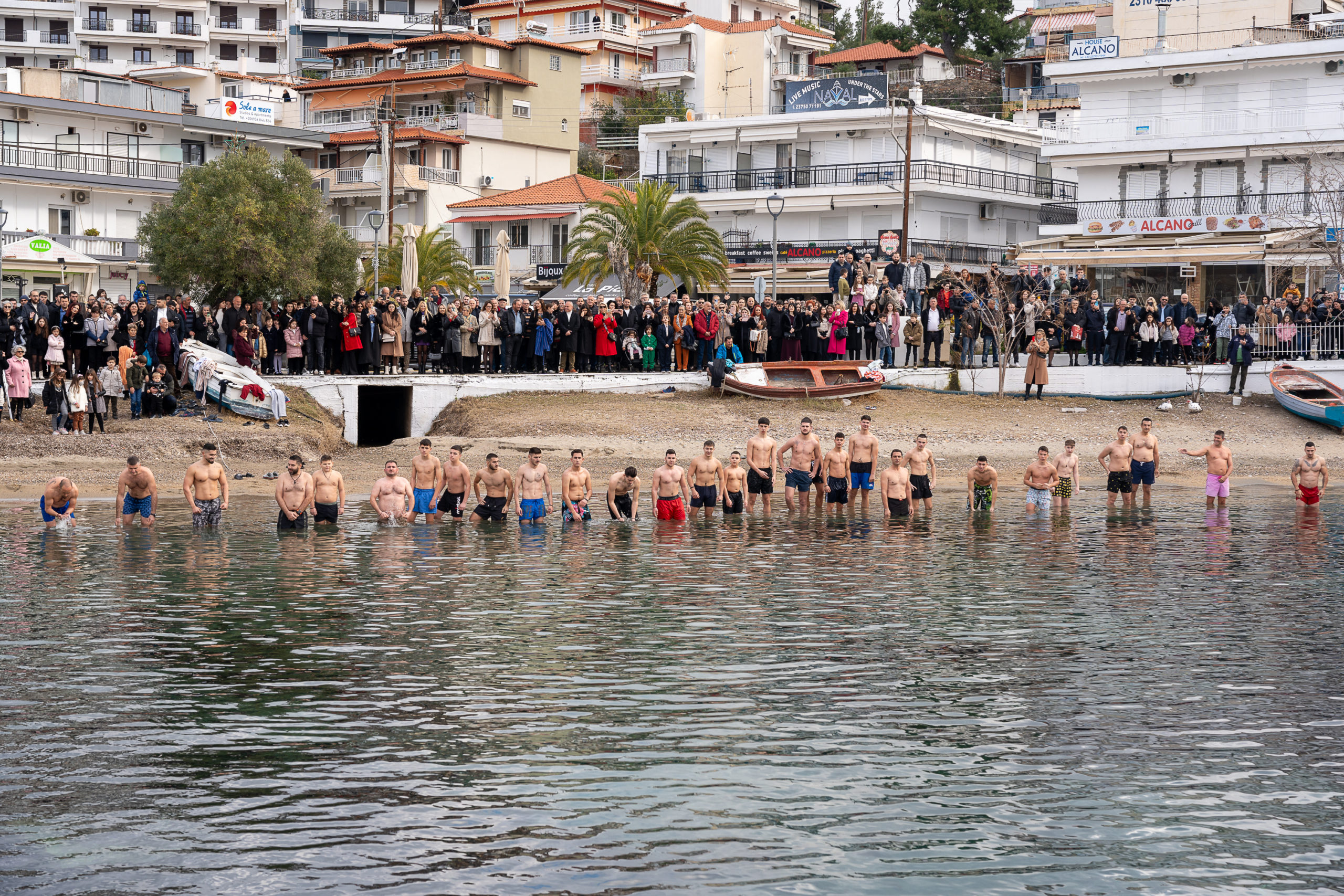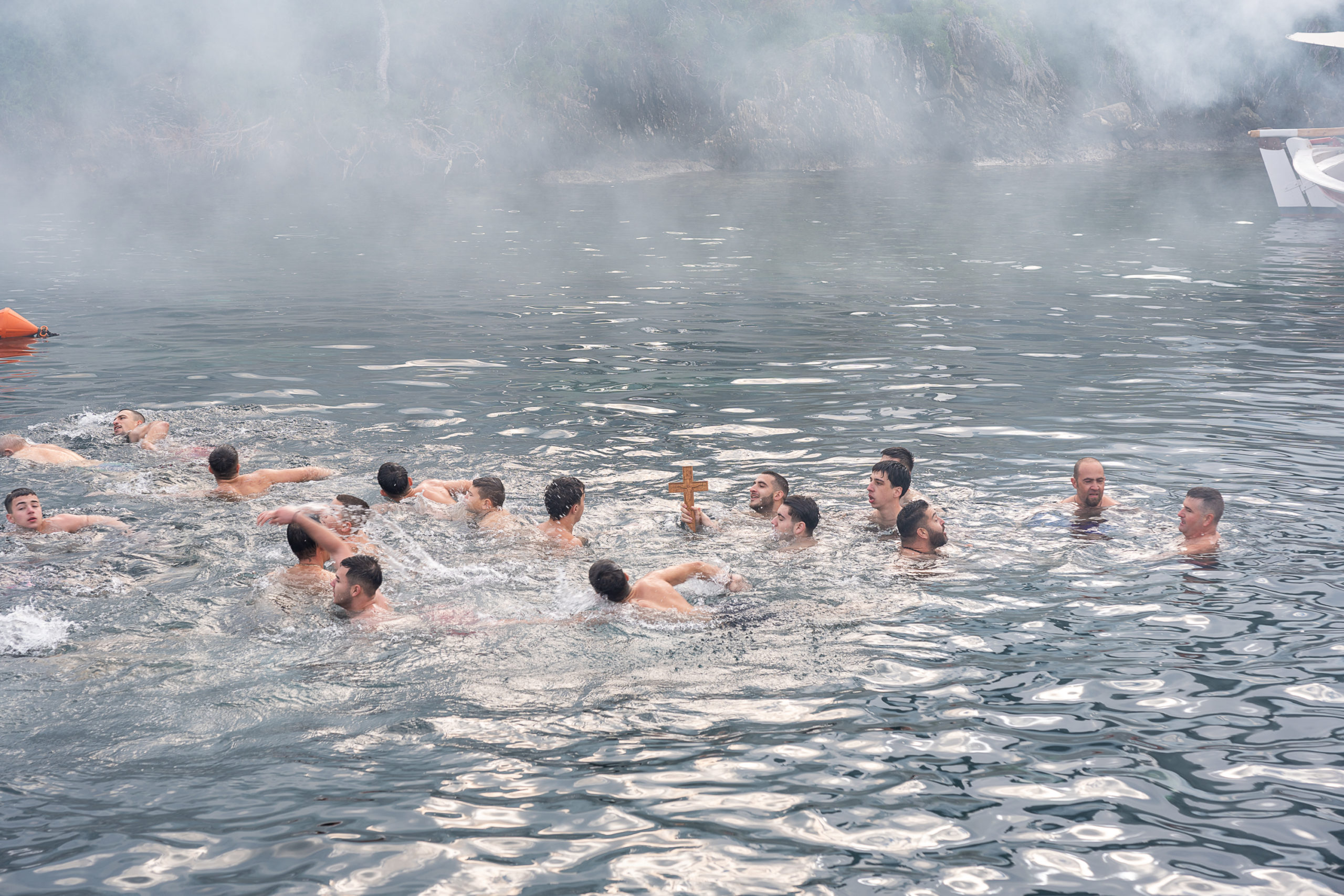 Ακολούθησε η λιτανεία, από τον ναό στην προβλήτα, όπου και έγινε ο Αγιασμός των Υδάτων. Περισσότεροι από 30 νέοι ήταν οι κολυμβητές που έπεσαν στα παγωμένα νερά αψηφώντας το κρύο, για να πιάσουν το ιερό σύμβολο της Ορθοδοξίας.