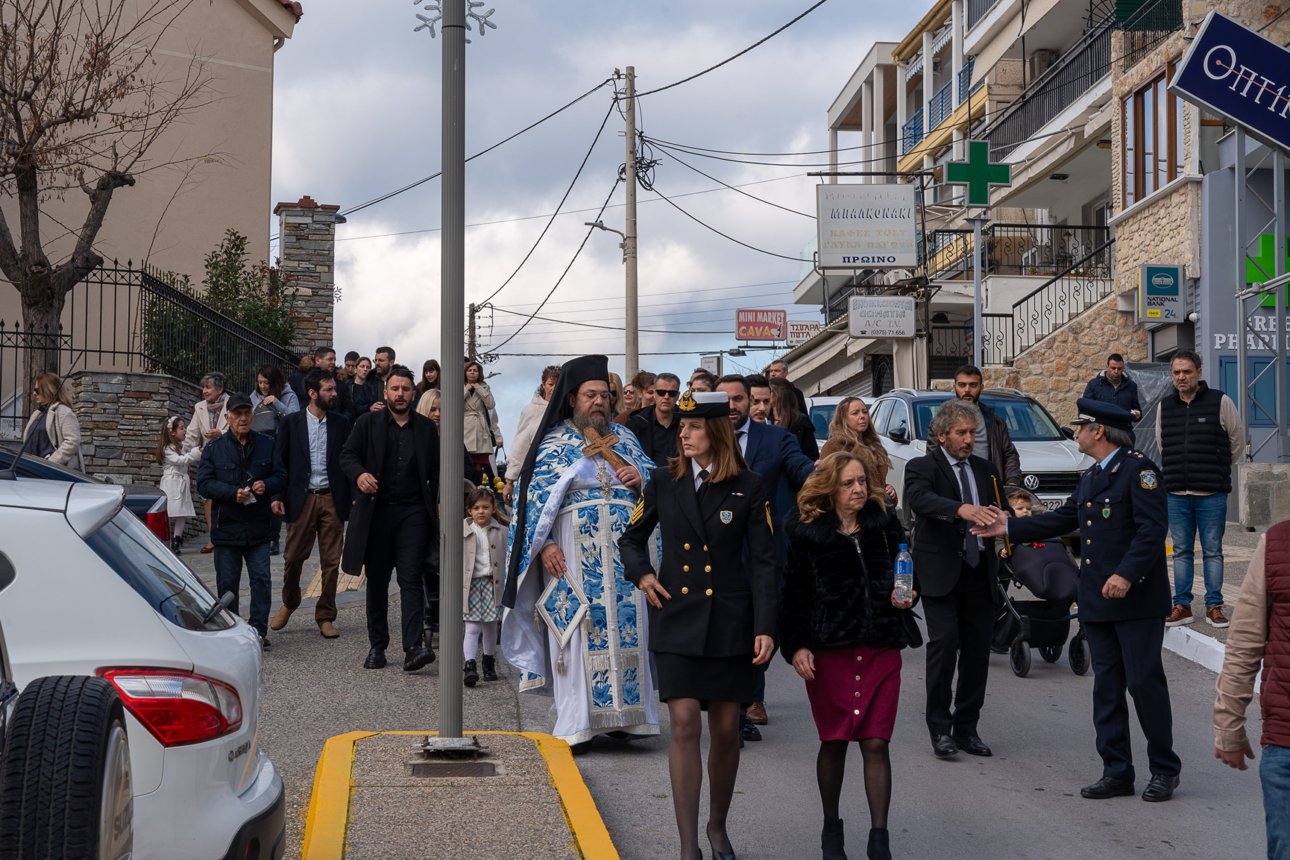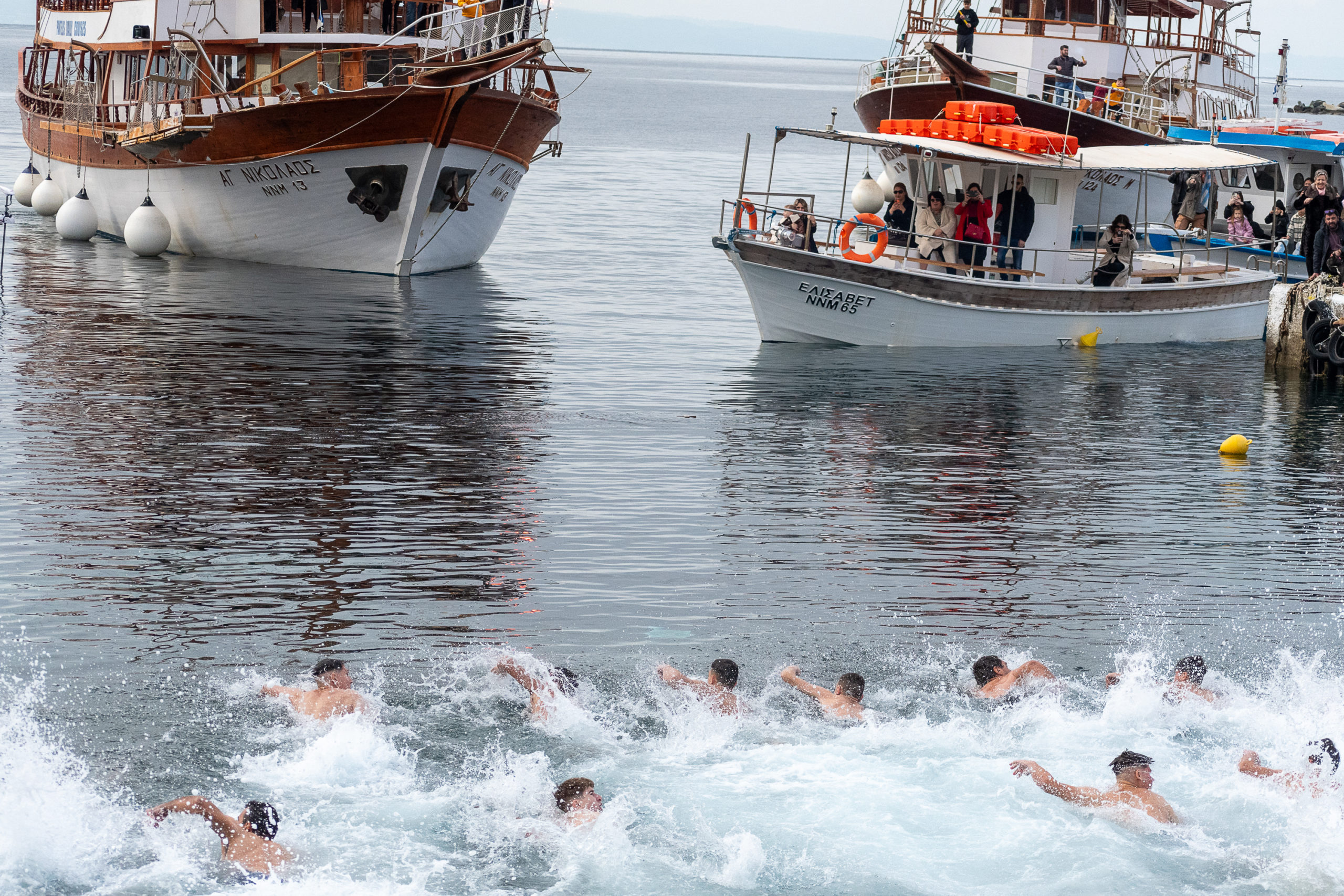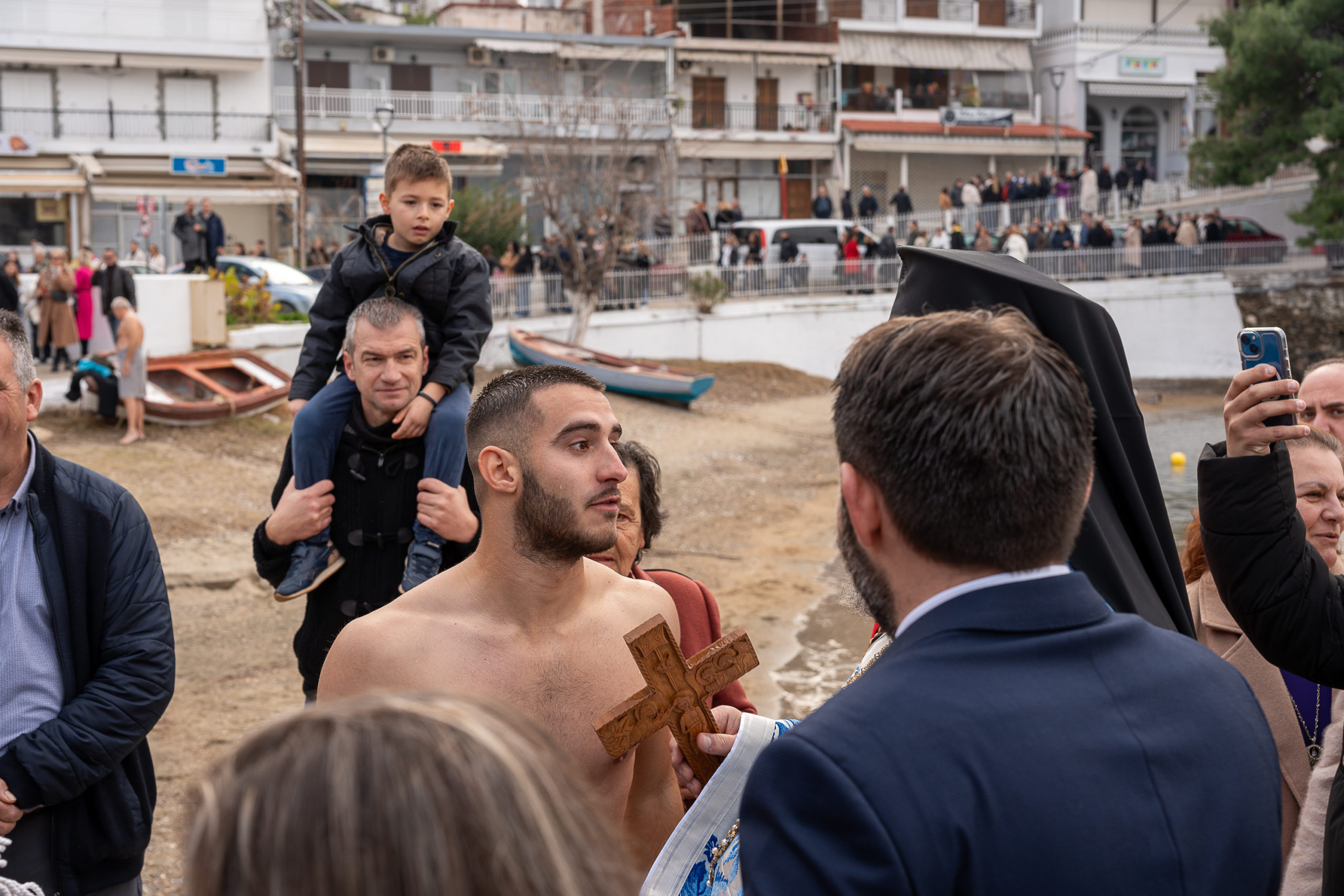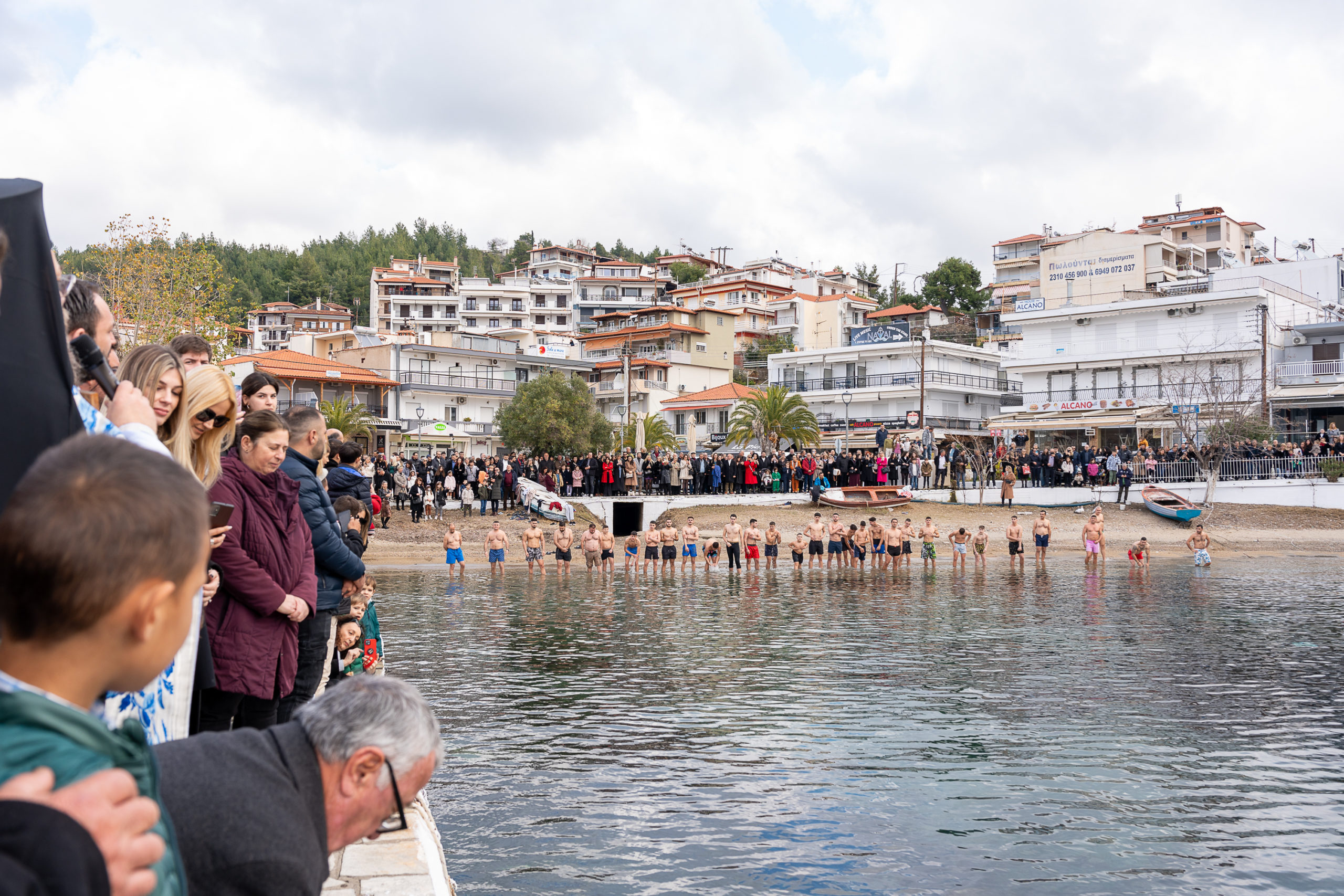 Ακολούθησε η λιτανεία, από τον ναό στην προβλήτα, όπου και έγινε ο Αγιασμός των Υδάτων. Περισσότεροι από 30 νέοι ήταν οι κολυμβητές που έπεσαν στα παγωμένα νερά αψηφώντας το κρύο, για να πιάσουν το ιερό σύμβολο της Ορθοδοξίας.