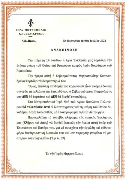 Με λιτές ακολουθίες επί τη εορτή του Οσίου Νικοδήμου του Αγιορείτου και χωρίς να δεχθεί επισκέψεις, εξαιτίας της πανδημίας, ανακοίνωσε πως θα εορτάσει τα ονομαστήριά του, στις 14 Ιουλίου, ο Σεβασμιώτατος Μητροπολίτης Κασσανδρείας κ. Νικόδημος.
