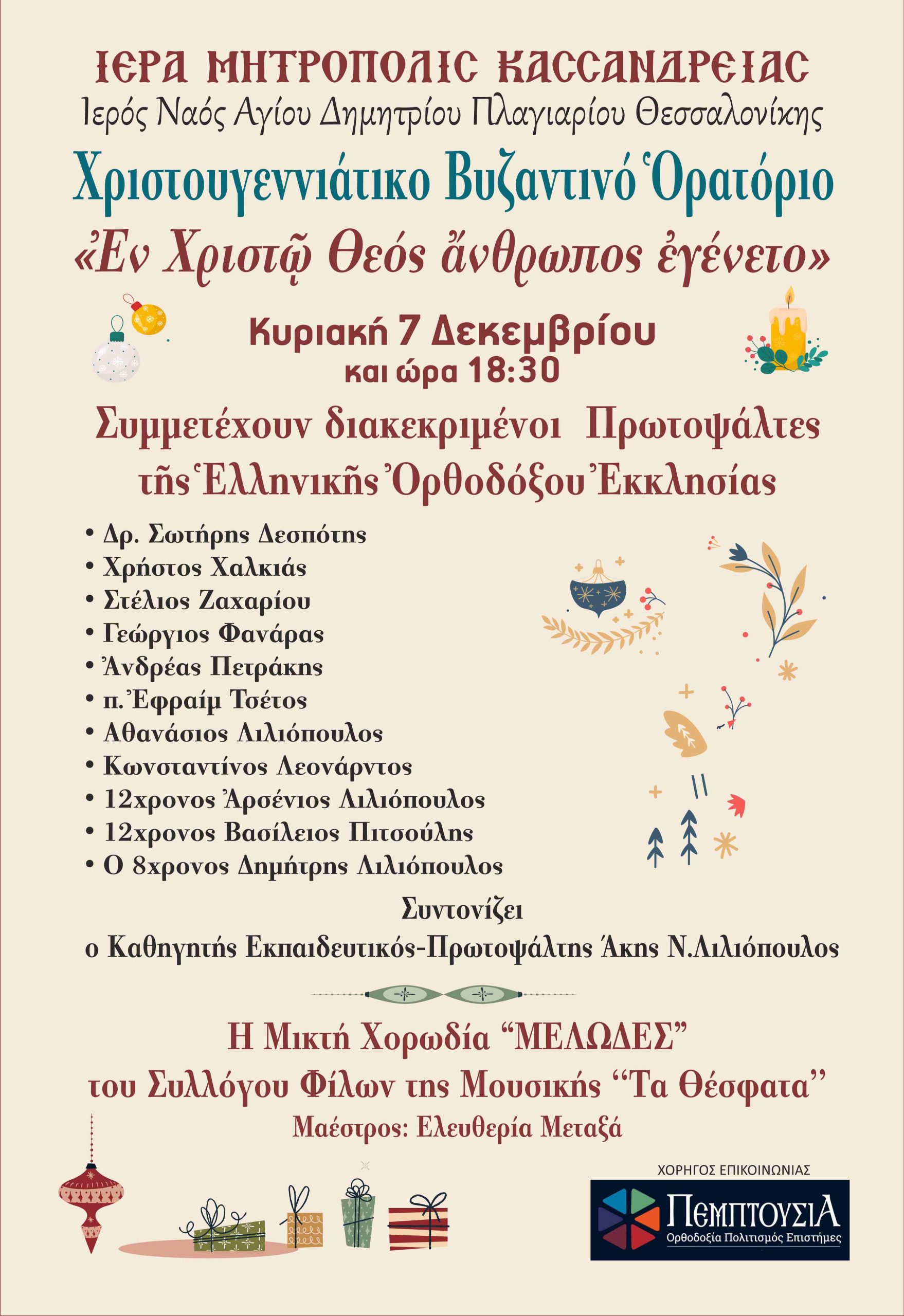 Η Ιερά Μητρόπολη Κασσανδρείας και ο Ιερός Ναός Αγίου Δημητρίου Πλαγιαρίου Θεσσαλονίκης σας προσκαλούν σε μία μοναδική, κατανυκτική και υψηλής καλλιτεχνικής ποιότητας μουσική βραδιά, που θα σημάνει πανηγυρικά την έναρξη του εορταστικού δωδεκαημέρου!