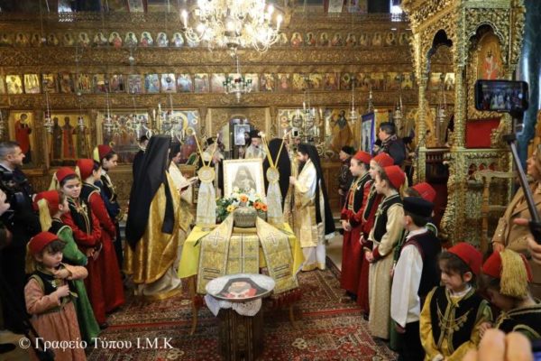 Στο κέντρο του Ιερού Ναού είχαν τοποθετηθεί μαζί με τα κόλλυβα, η μίτρα και η φωτογραφία του θρυλικού Ιεράρχου και είχαν «περικυκλωθεί», από τα παραδοσιακά ενδεδυμένα παιδιά.
