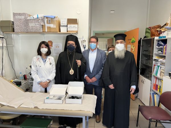 Ο Σεβασμιώτατος μίλησε στους ιατρούς, και στην συνέχεια μαζί με τον π. Ελευθέριο παρέδωσαν στο Νοσοκομείο ένα παιδικό πιεσόμετρο, προσφορά του Φιλοπτώχου Ταμείου του Ιερού Ναού Αγίου Νικάνορος.