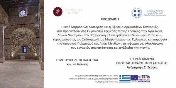 04/09/2024 04/09/2024 Την Παρασκευή 6 Σεπτεμβρίου 2024 και ώρα 11:00 πμ. στην Ιερά Μονή Τσούκας στην Αγία Άννα, θα πραγματοποιηθούν τα θυρανοίξια και η επίσημη παράδοση του έργου της αποκατάστασης και ανάδειξης της Ιεράς Μονής.   Την επίβλεψη του έργου είχε η Εφορία Αρχαιοτήτων Καστοριάς, υπό την καθοδήγηση της προϊσταμένης κ. Ανδρομάχης Σκρέκα. Η Ιερά Ακολουθία θα...