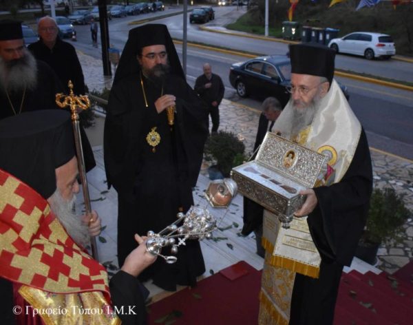 Το απόγευμα της Τετάρτης 8 Νοεμβρίου, πραγματοποιήθηκε η υποδοχή του ιερού λειψάνου του Αγίου Καλλινίκου, στα προπύλαια του ιερού Ναού. Το Ιερό Λείψανο κόμισε ο Μητροπολίτης Ναυπάκτου κ. Ιερόθεος.