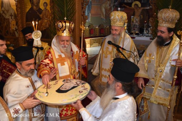 Στο τέλος της θείας Ευχαριστίας, αφού ευλογήθηκαν τα εορταστικά κόλλυβα του Αγίου, ο Σεβασμιώτατος Ποιμενάρχης κ. Καλλίνικος ευχαρίστησε τους Μητροπολίτες Ναυπάκτου κ. Ιερόθεο και Γρεβενών κ. Δαβίδ.