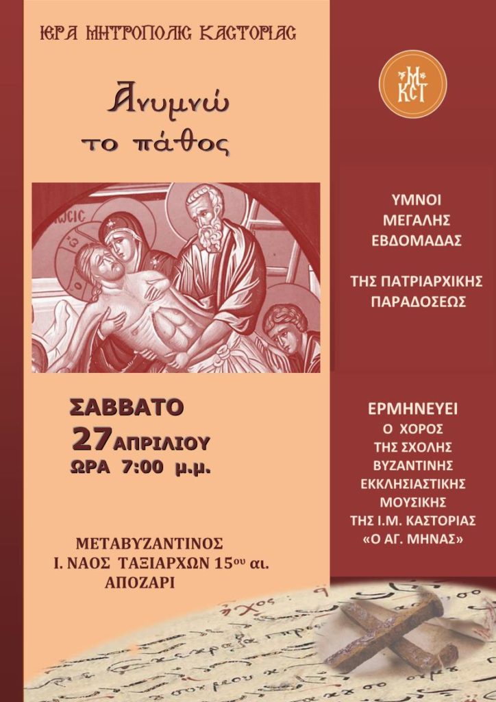 Μουσική Εκδήλωση με τίτλο «Ανυμνώ το πάθος» θα πραγματοποιηθεί από την Σχολή Εκκλησιαστικής Μουσικής της Ιεράς Μητρόπολης Καστορίας, το Σάββατο του Λαζάρου, 27 Απριλίου στις 19:00, στον Ιερό μεταβυζαντινό Ναό των Παμμεγίστων Ταξιαρχών – Απόζαρι.