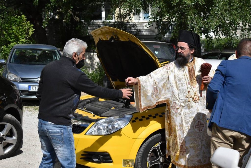 Στο τέλος της Θείας Λειτουργίας ο Σεβασμιώτατος τέλεσε την Ακολουθία του Αγιασμού για να αγιάσει τα επαγγελματικά οχήματα που είχαν φέρει έξω από τον Ιερό Ναό οι οδηγοί τους, κυρίως οι οδηγοί Ταξί, τους οποίους προσκάλεσε ιδιαιτέρως ο Σεβασμιώτατος για μια καλύτερη γνωριμία και προσέγγιση.
