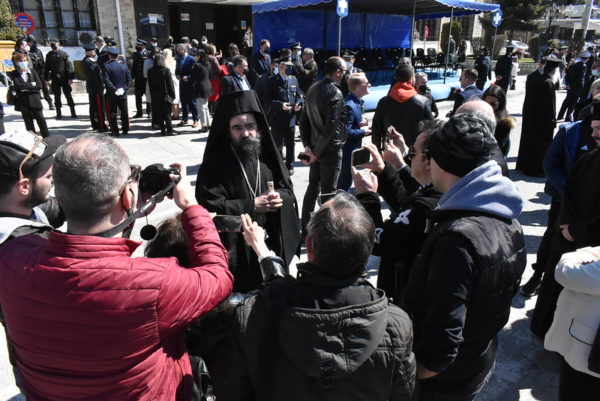 Στην συνέχεια ο Σεβασμιώτατος μετέβη μετά των επισήμων στην πλατεία Μακεδονομάχων, όπου τέλεσε Επιμνημόσυνη Δέηση στην μνήμη όλων όσων θυσιάστηκαν για την ελευθερία της πατρίδος μας και η κατάθεση των στεφάνων, ενώ αμέσως μετά παρακολούθησε και την καθιερωμένη μαθητική και στρατιωτική παρέλαση στην Λεωφόρο Μεγάλου Αλεξάνδρου.