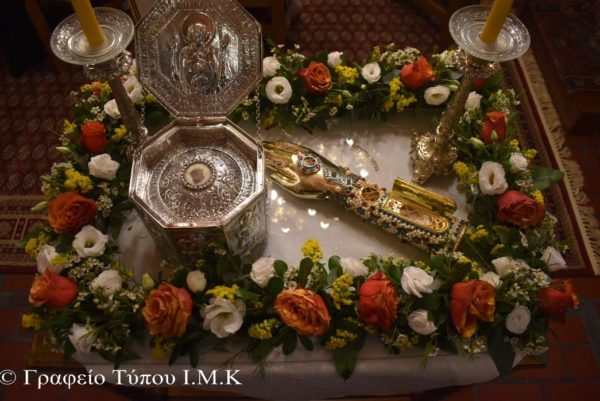 Η Ιερά Πομπή, κατευθύνθηκε στον Ιερό Μητροπολιτικό Ναό, όπου την ιερά εικόνα και τα λείψανα του Αγίου, υποδέχθηκαν οι πανηγυρικές καμπανοκρουσίες, και οι ιερείς του Ναού.