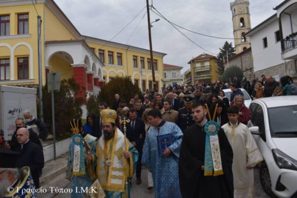 Στην συνέχεια ξεκίνησε η λιτανευτική πομπή, από τον Μητροπολιτικό Ναό προς το σημείο «Σταυρός», για τον καθαγιασμό των υδάτων και την ρίψη του Τιμίου Σταυρού στα κρύα νερά της λίμνης, συνοδεία, αγήματος του Στρατού και Συλλόγων με παραδοσιακές φορεσιές.
