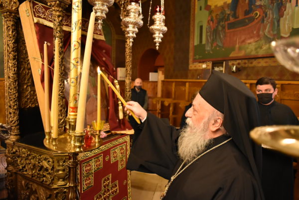 Αφού χοροστάτησε στην ακολουθία του Όρθρου στο τέλος της δοξολογίας πραγματοποιήθηκε η προσκύνηση του Τιμίου Σταυρού. Στην συνέχεια προεξήρχε της Αρχιερατικής Θείας Λειτουργίας με συλλειτουργούντες τους π. Λούππο Κουκουρίκο, π. Αναστάσιο Σεμερτζίδη αλλά και τους διακόνους της Μητροπόλεως.