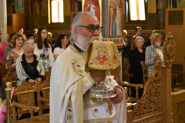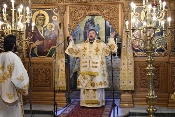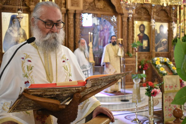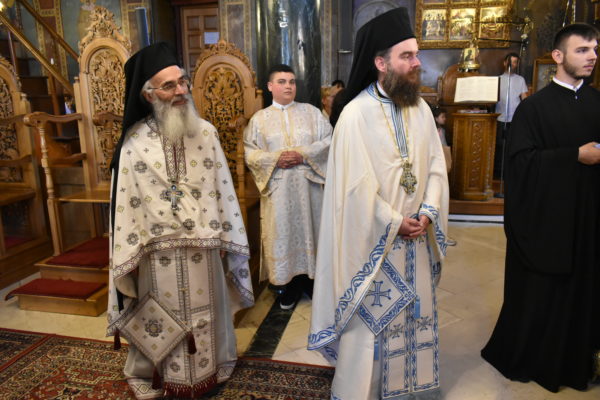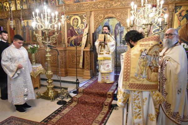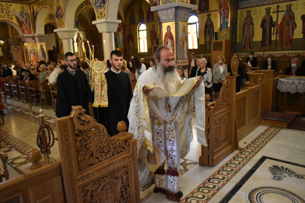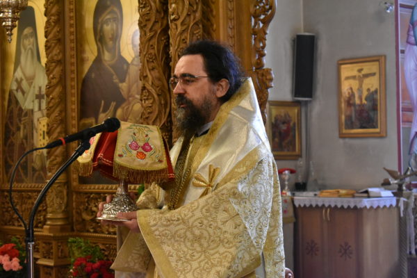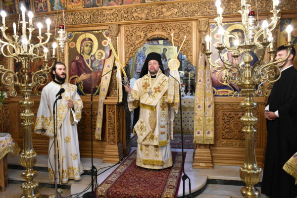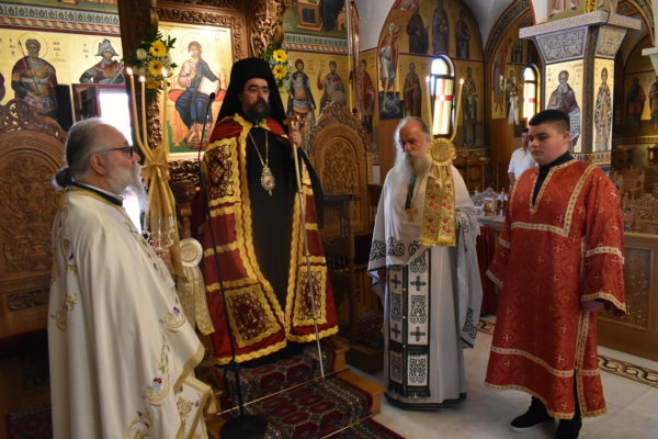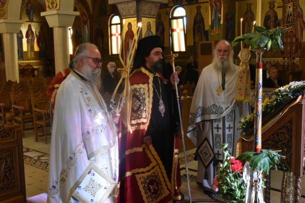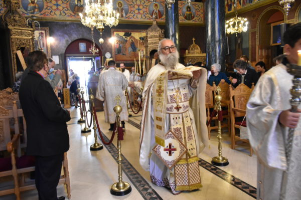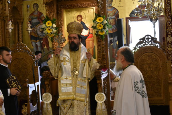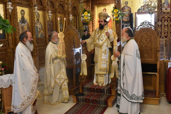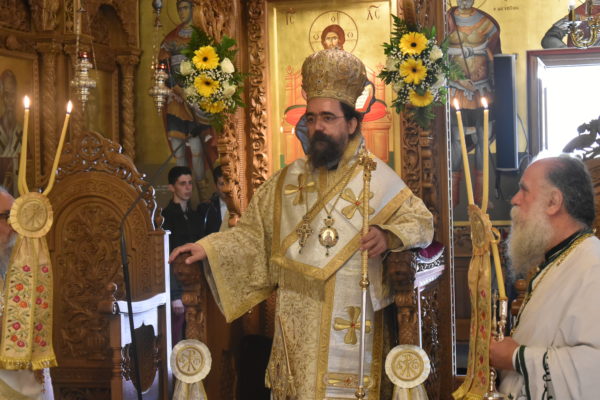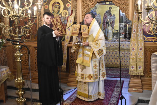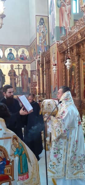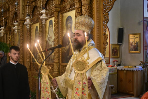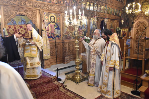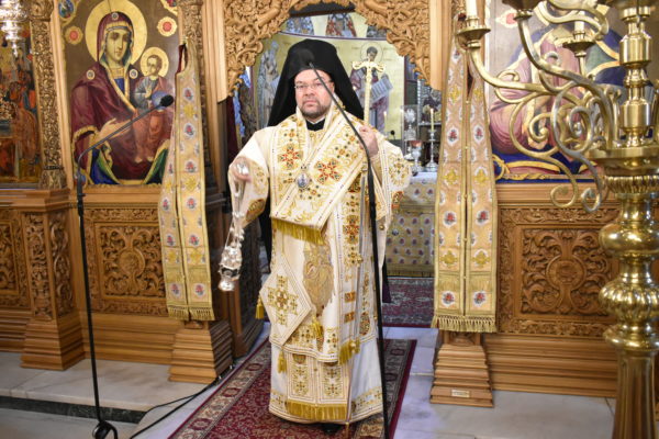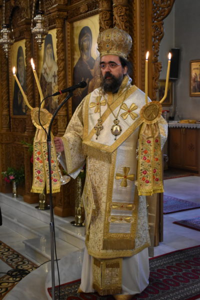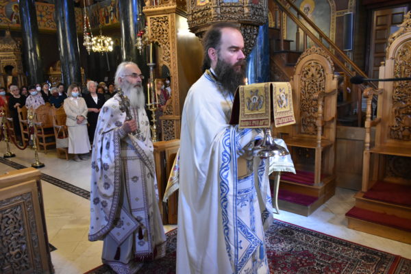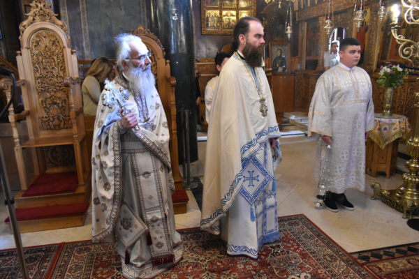 Τον Θεοφιλέστατο Ιεράρχη πλαισίωσαν ο εφημέριος του Ιερού Ναού π. Ελευθέριος Συτιλίδης και ο διάκονος π.Παντελεήμων.