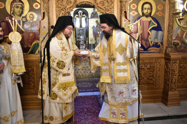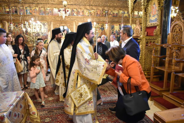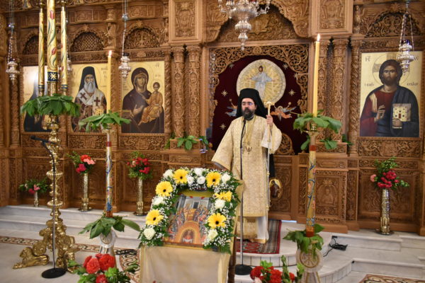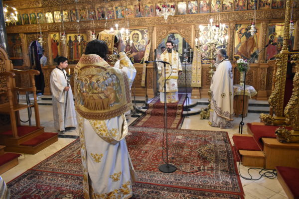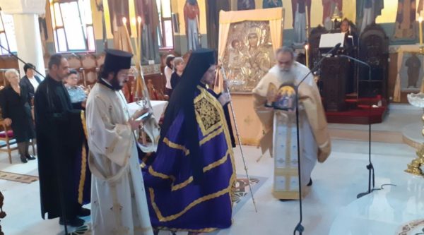 Τέλος, ο εφημέριος του Ιερού Ναού Πρωτοπρεσβύτερος π. Ελευθέριος Συτιλίδης, προσέφερε στον Θεοφιλέστατο μια εικόνα της Θεοτόκου, σε ανάμνηση της ιερουργίας του στην Ενορία κατά την μεγάλη αυτή Δεσποτική Εορτή.