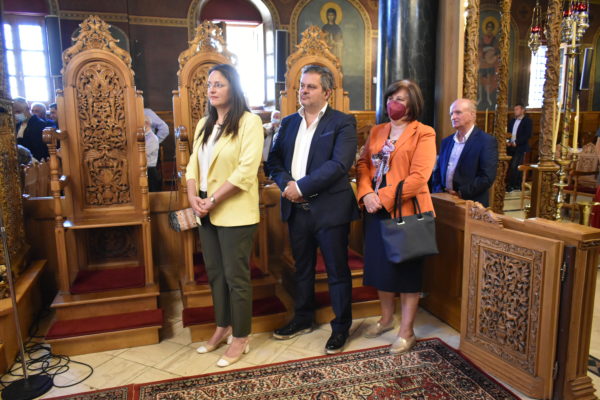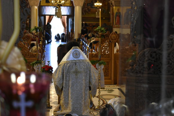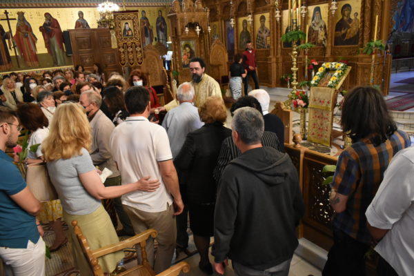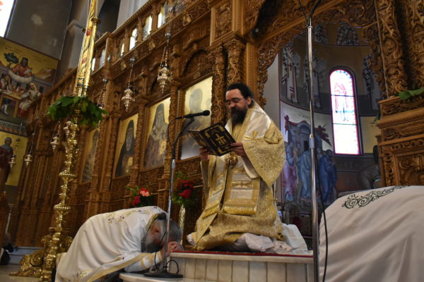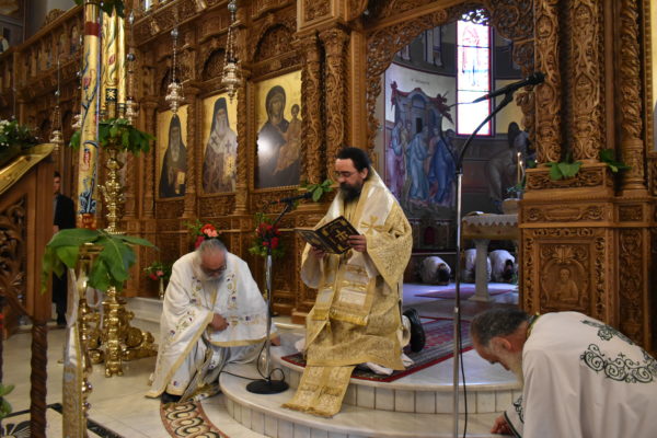 Μετά την απόλυση της Θείας Ευχαριστίας, τελέσθηκε κατά την τάξη της Εκκλησίας μας, ο Μέγας Εσπερινός του Αγίου Πνεύματος με τις Ευχές της Γονυκλισίας.