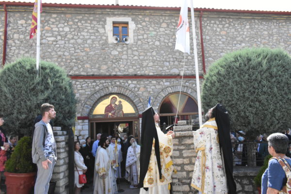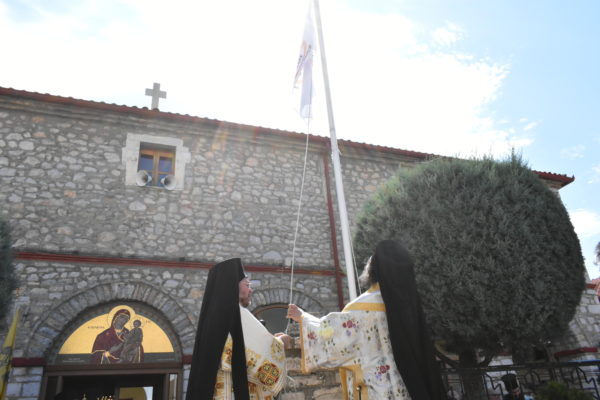 Τέλος, οι Αρχιερείς κατευθύνθησαν στα προπύλαια του Ιερού Ναού, όπου παρουσίᾳ του Αντιδημάρχου κ. Σωκράτη Πέλκα εκπροσώπου του Δημάρχου Καστορίας, της Προέδρου του Περιφερειακού Συμβουλίου Δυτικής Μακεδονίας κ. Κάλλης Κυριακίδου και του εκκλησιάσματος ύψωσαν την σημαία της επετείου των 100 ετών από την Μικρασιατική Καταστροφή, ψάλλοντας όλοι μαζί τον εθνικό ύμνο και το Τη Υπερμάχω Στρατηγώ.