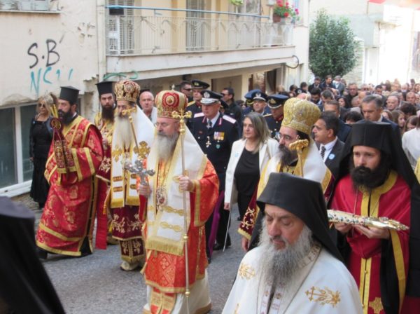 Στο τέλος, κλήρος και λαός μετέβησαν στο μνημείο Ηρώων, στην πλατεία Μακεδονομάχων, όπου τελέστηκε Επιμνημόσυνη Δέηση και κατάθεση στεφάνου.