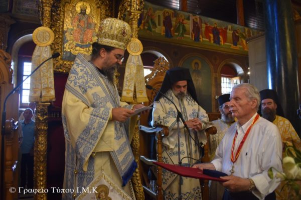 Ὅλα αὐτά ὤθησαν ἐμένα καί τούς συνεργάτες μου, νά σκεφθοῦμε καί νά τιμήσουμε καί νά ἀνταποδώσουμε τίς εὐεργεσίες αὐτές, σήμερα, Κυριακή τῶν Ἀποδήμων, πού εἶναι ἀφιερωμένη στούς Ἀποδήμους, μέ τό μεγάλο παράσημο τῆς Ἱερᾶς Μητροπόλεώς μας, ἤτοι μέ τό παράσημο καί τό εὐεργετήριο τῆς Παναγίας τῆς Πορφύρας, τῆς εἰκόνος πού εὐλογεῖ τόν Ἱερό Μητροπολιτικό μας Ναό Κοιμήσεως Θεοτόκου Καστοριᾶς.