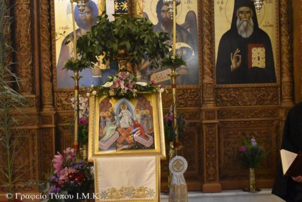 Την ίδια ώρα, ο σεπτός μας ποιμενάρχης, με εμφανή την χαρά από την αναστάσιμη προσμονή και νίκη της ζωής κατά του θανάτου, έρανε με εκατοντάδες φύλλα δάφνης όλο τον Ιερό Ναό και τους πιστούς, σε κάθε κλίτος, συμβολίζοντας την συντριβή του Άδη απέναντι στην πηγή της αιώνιας ζωής!
