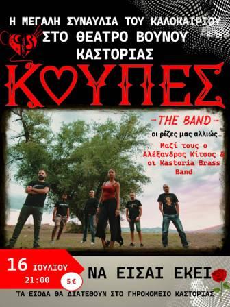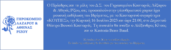 Φιλανθρωπικού χαρακτήρα μουσική εκδήλωση του Ιδρύματος, με το Καστοριανό συγκρότημα «ΚΟΥΠΕΣ», διοργανώνεται από Δ.Σ. του Γηροκομείου Καστοριάς Λάζαρου & Αθηνάς Ρίζου, την Κυριακή 16 Ιουλίου 2023 και ώρα 21:00, στο Δημοτικό Θέατρο Βουνού Καστοριάς