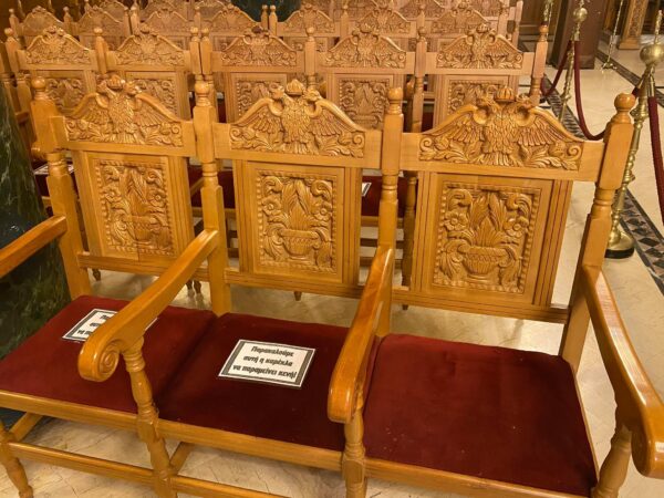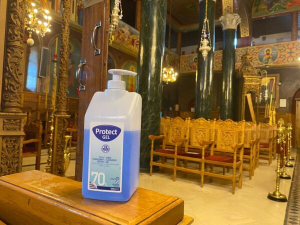 Μεταξύ των καθισμάτων έχουν τοποθετηθεί πινακίδες οι οποίες ορίζουν τις αποστάσεις που θα πρέπει να τηρούνται μεταξύ των πιστών, ενώ έχει δημιουργηθεί και ο χώρος για την απολύμανση των χεριών, έτσι ώστε να ληφθεί η κατάλληλη προστασία από τους πιστούς.