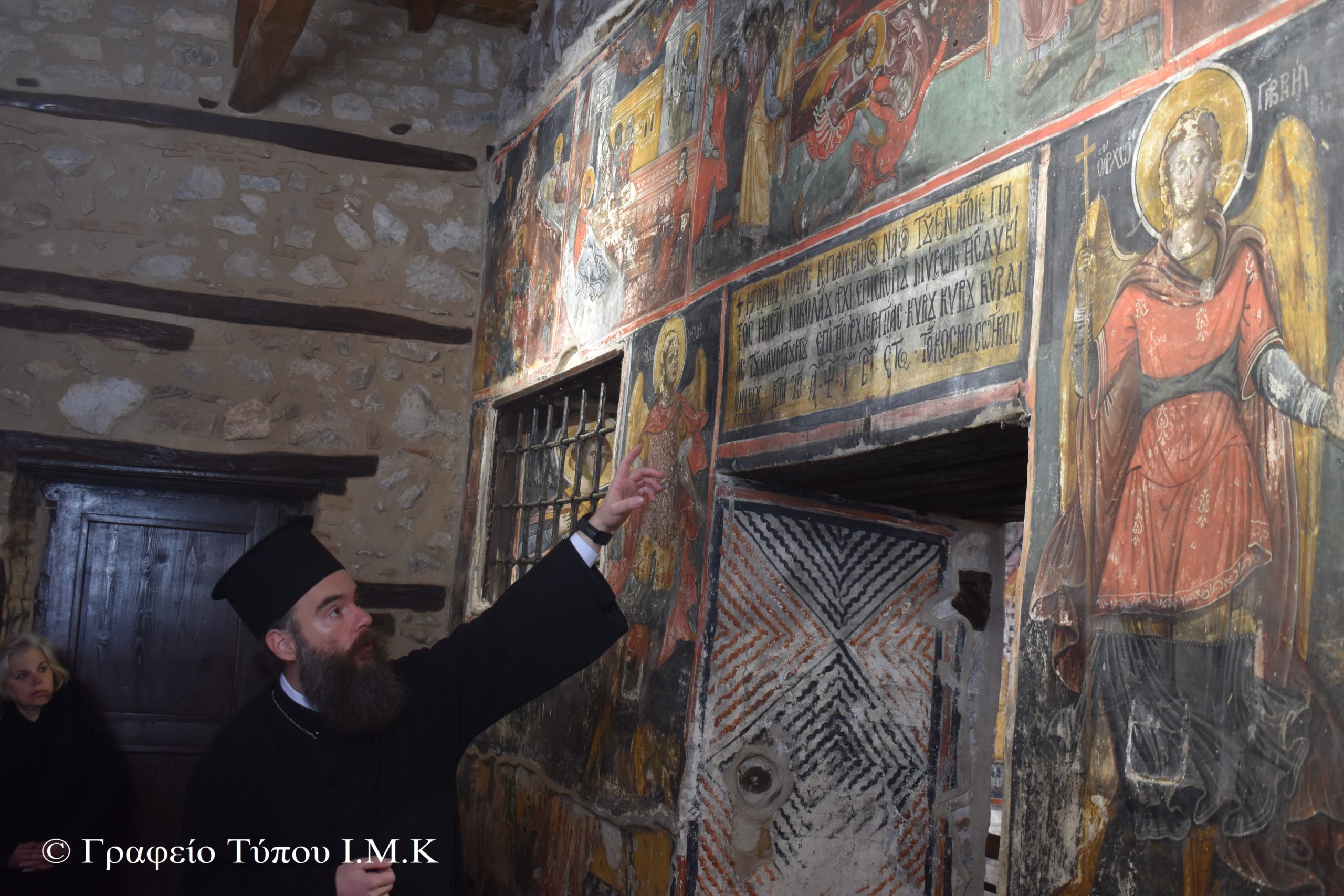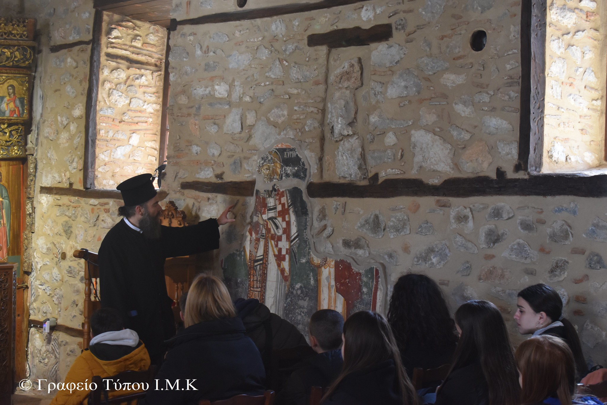 Την περιήγηση στο μεταβυζαντινό παρεκκλήσιο, έκανε ο Αρχιμ. Στέφανος Σχοινάς ο οποίος πληροφόρησε τους μαθητές για τα ιστορικά στοιχεία του ναού και της περιοχής, την σύνδεση του με ιστορικά πρόσωπα της πόλης, τα αρχιτεκτονικά μέρη και την χρήση τους καθώς και τον τοιχογραφικό διάκοσμο.