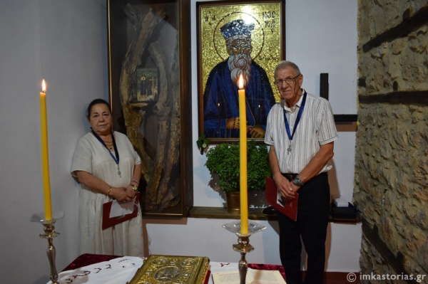 Πανηγυρικώ τω τρόπω, λοιπόν, τελέσθηκε ο Αρχιερατικός Εσπερινός, χοροστατούντος του Σεβασμιωτάτου Μητροπολίτου Καστορίας κ. Σεραφείμ, προ του οποίου πραγματοποιήθηκε η Ακολουθία των Θυρανοιξίων και ο Αγιασμός για την ανακαίνιση και ανάδειξη του Μεταβυζαντινού αυτού Ναού. Ο Εσπερινός τελέσθηκε στον αύλειο χώρο, όπου δεσπόζει το ψηφιδωτό του Αγίου, προκειμένου να τηρηθούν με μεγαλύτερη ασφάλεια οι προβλεπόμενες από τον νόμο αποστάσεις.