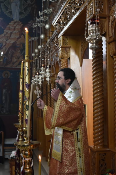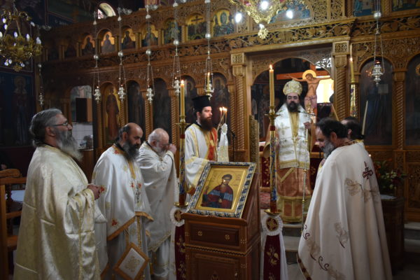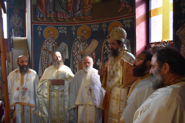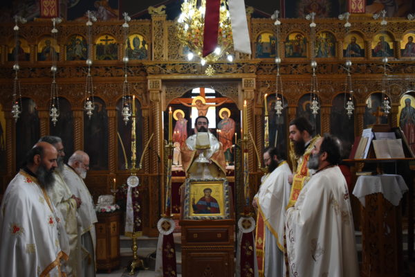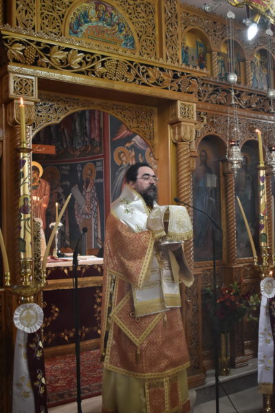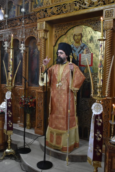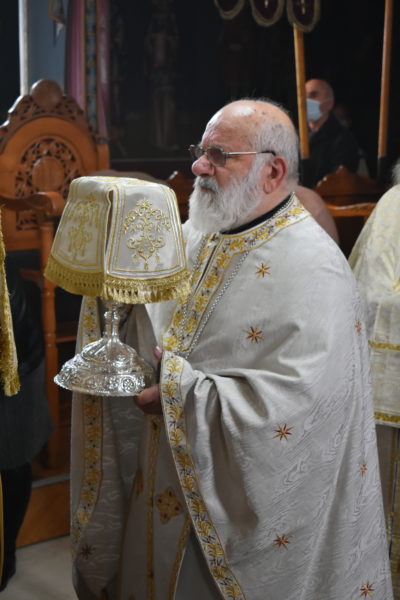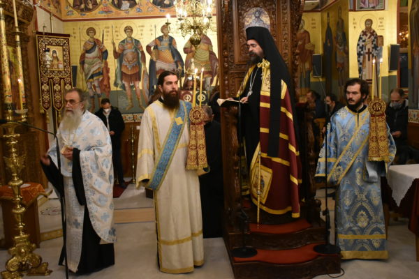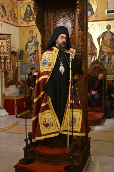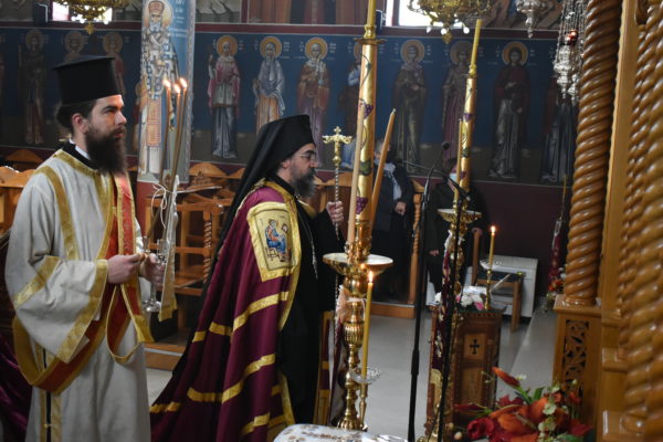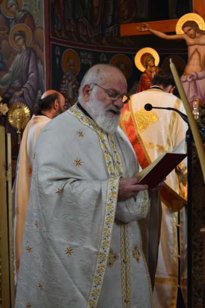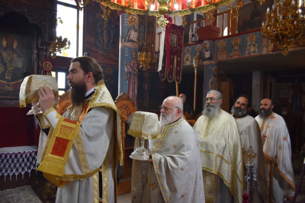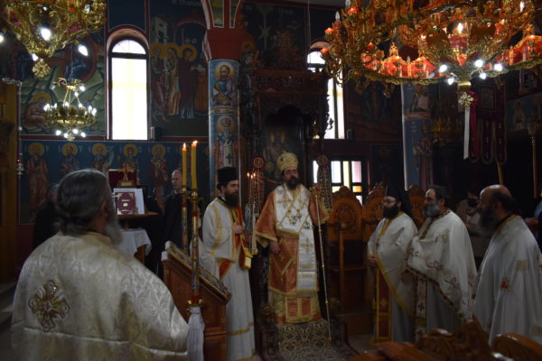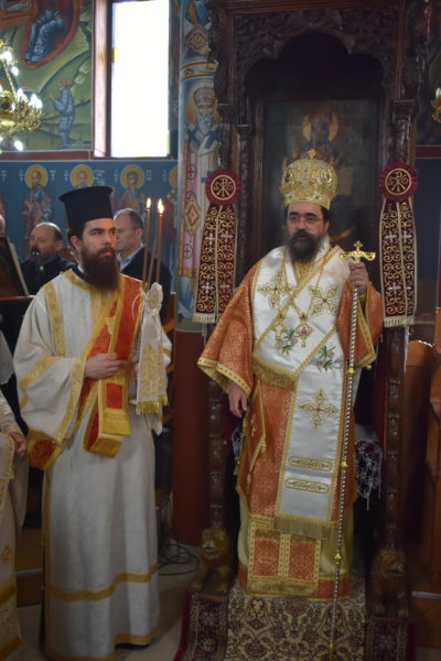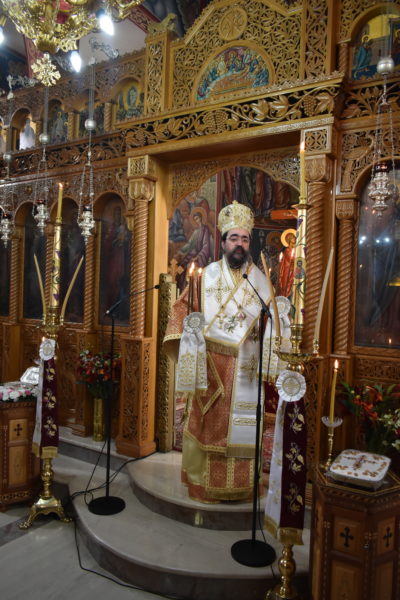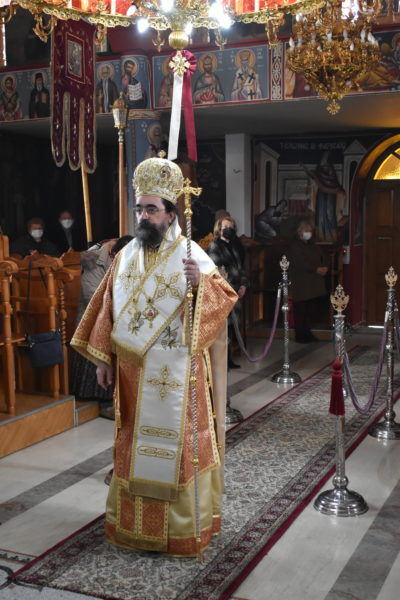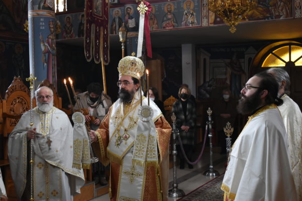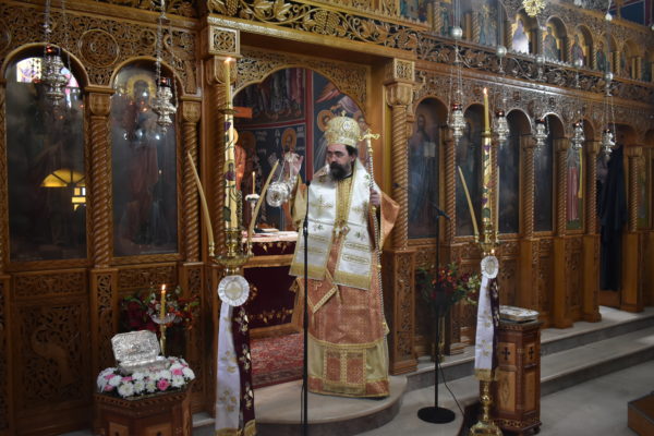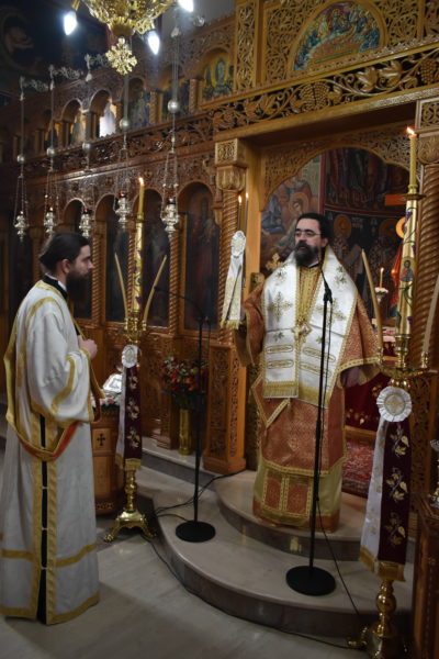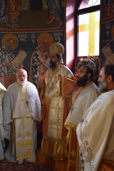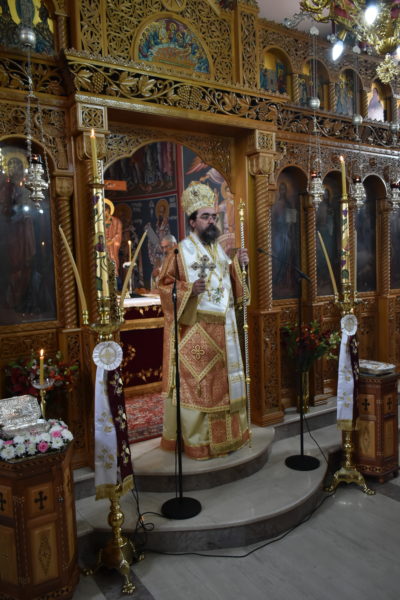 Αφού χοροστάτησε στην ακολουθία του Όρθρου προεξήρχε της Αρχιερατικής Θείας Λειτουργίας με συλλειτουργούς τους π. Γεώργιο Ταξόπουλο, π. Ιάκωβο Πνευμονίδη, π. Γεώργιο Καραγιαννίδη, π. Λάζαρο Καραβασίλη, π. Κωνσταντίνο Τομπατσίδη και τον διάκονο π. Παύλο.