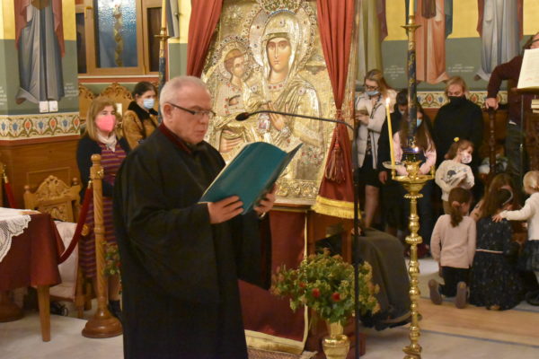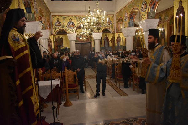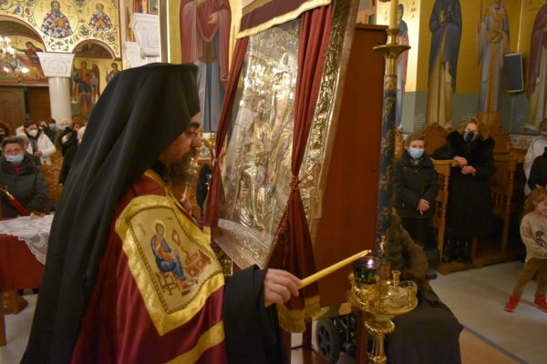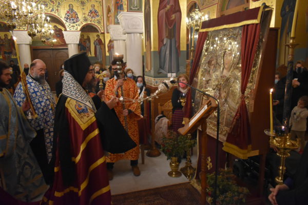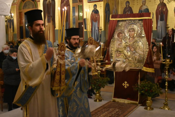 Μετά την ακολουθία του Αποδείπνου και του κανόνα ο Σεβασμιώτατος απήγγειλε τους έξι οίκους της Β΄ Στάσης μπροστά στο αντίγραφο της θαυματουργού εικόνος της Παναγίας της Τριχερούσης, προερχομένης από την Ι.Μ. Χιλανδαρίου.