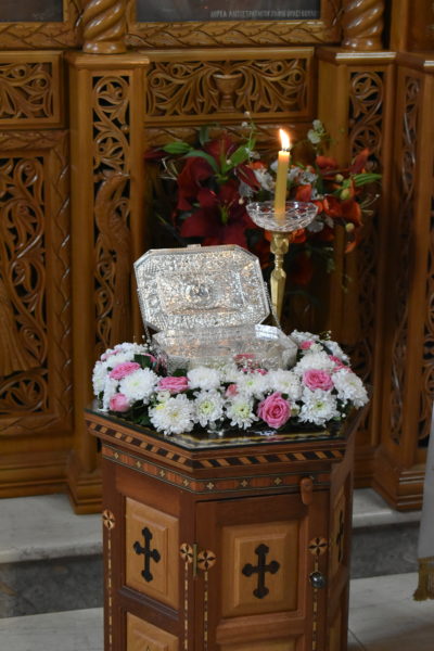 Στο τέλος της Θείας Λειτουργίας ευλόγησε τα κόλυβα προς τιμήν του Αγίου Χρυσάνθου και ευχαρίστησε τον Εφημέριο π. Κωνσταντίνο για την ευπρέπεια του Ναού, τους Ιεροψάλτες, κ. Χρήστο Τογκαρίδη και τους ψάλτες του Ναού για την εξαίσια ψαλμωδία, και τους πιστούς για την αγάπη τους στην Εκκλησία.
