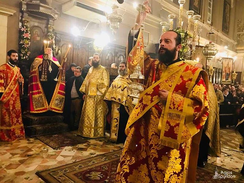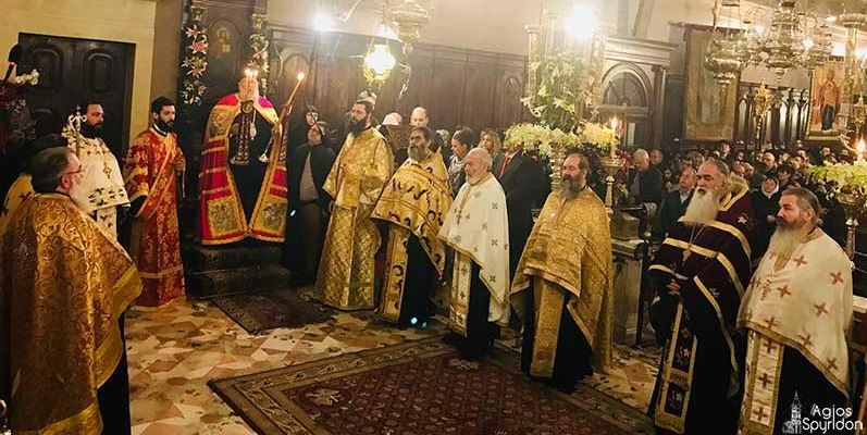 Συνεχίζονται οι λατρευτικές εκδηλώσεις στο Ιερό Προσκύνημα του Αγίου Σπυρίδωνος για την Μνήμη του. Το απόγευμα του Τετάρτης 12 Δεκεμβρίου 2018 τελέστηκε Αρχιερατικός Εσπερινός χοροστατούντος του Σεβασμιωτάτου Μητροπολίτου Κερκύρας, Παξών και Διαποντίων Νήσων κ. Νεκταρίου.