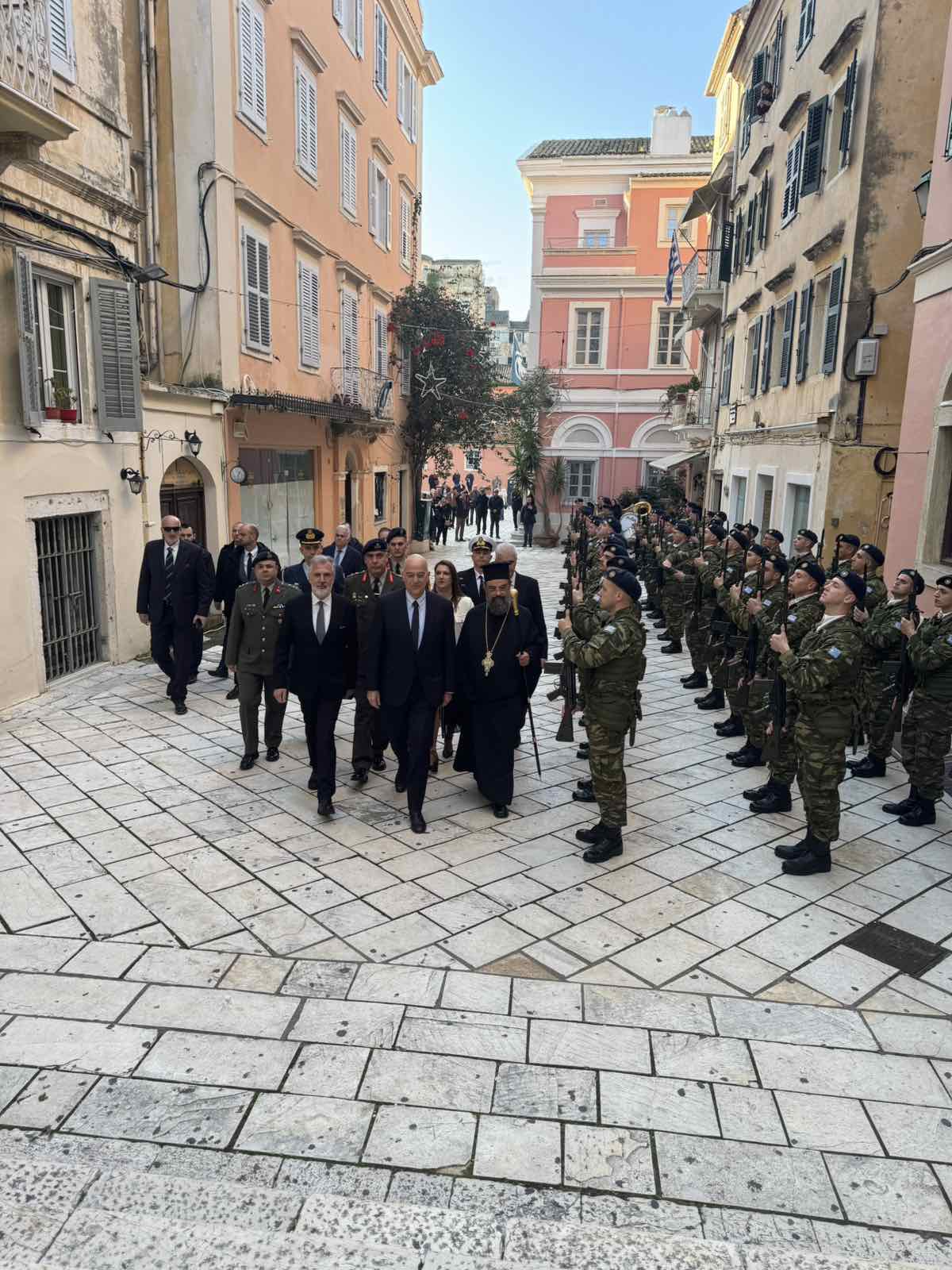 Η χαρά μας όμως πολλαπλασιάζεται, καθότι κοντά μας βρίσκεται ο Αξιότιμος Υπουργός Εθνικής Αμύνης, ο οικείος, ο Κερκυραίος κ. Νικόλαος Δένδιας. Γνωρίζουμε και εκτιμούμε βαθύτατα, κύριε Υπουργέ, την βαθιά σας πίστη. Γνωρίζουμε την αγάπη σας και τον σεβασμό σας για τον Άγιο Σπυρίδωνα. Γνωρίζουμε όμως και την αγάπη σας και την αδιάπτωτο διακονία σας για την πατρίδα μας. Υπηρετείτε σε ένα νευραλγικό υπουργείο, αυτό που κάνει όλους μας να αισθανόμαστε ασφαλείς για τα σύνορά μας, για την αντιμετώπιση εξωτερικών κινδύνων, για την διατήρηση της εθνικής μας υπερηφάνειας λόγω του ότι οι ένοπλες δυνάμεις είναι αυτές που εγγυώνται τη διατήρηση της ιστορίας, της παραδόσεως, της ελευθερίας του λαού μας κι εσείς αναλίσκεσθε καθημερινώς στον αγώνα να είναι σύγχρονες, να εμπνέουν σεβασμό, να λειτουργούν με ενσωμάτωση των νέων τεχνολογιών, με ισορροπία, με δυναμισμό, αλλά και εμπνέοντας ασφάλεια.