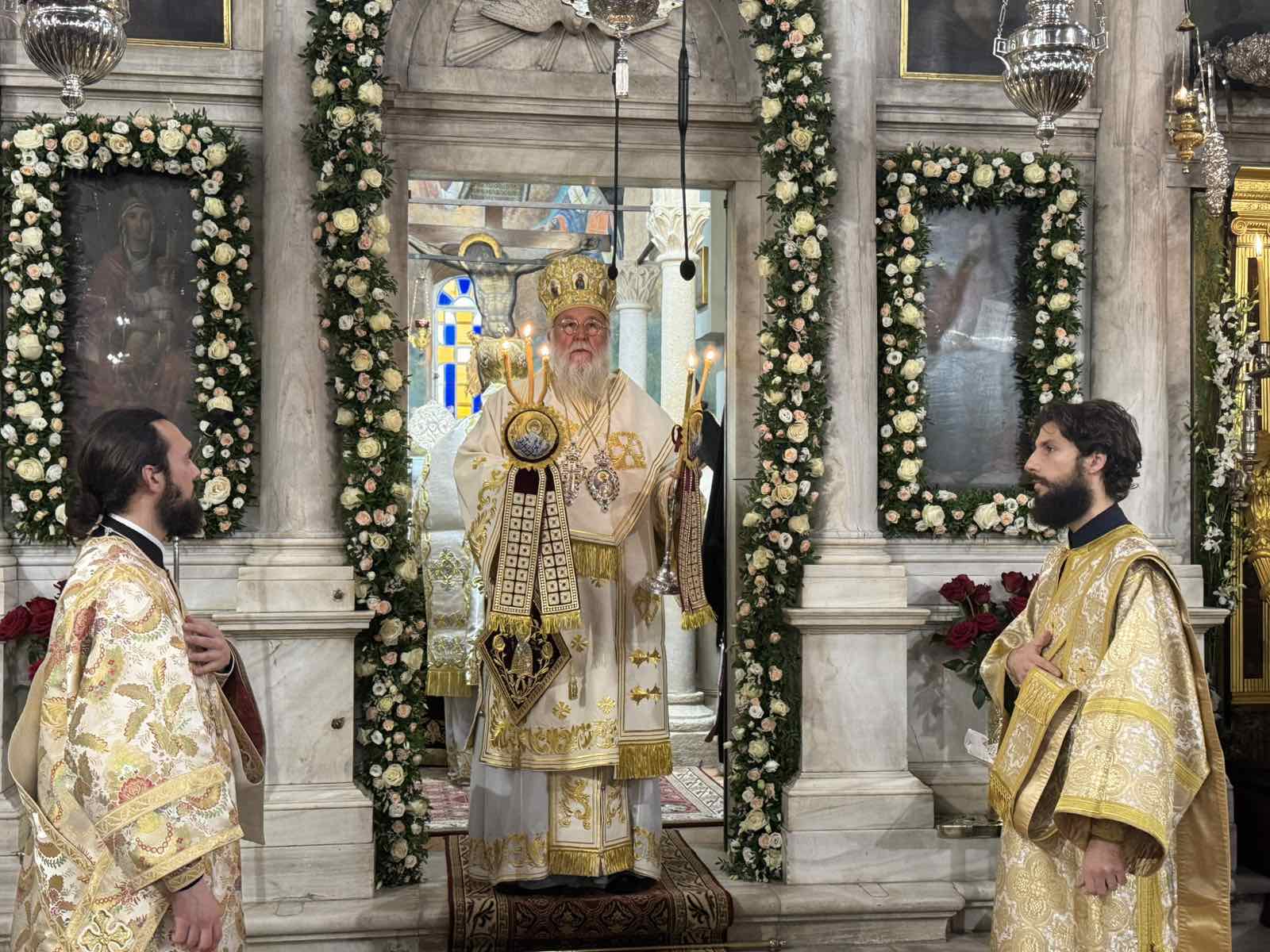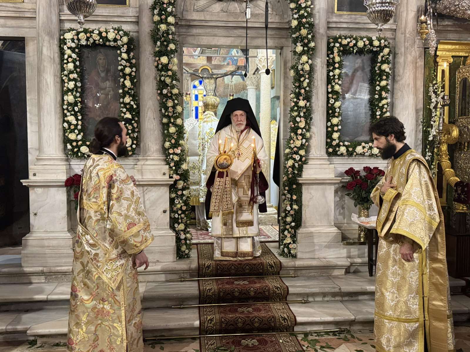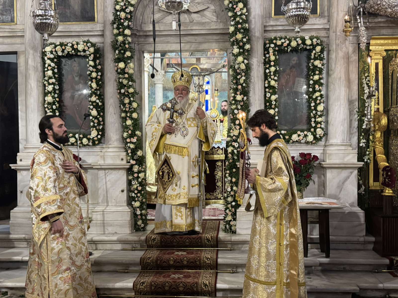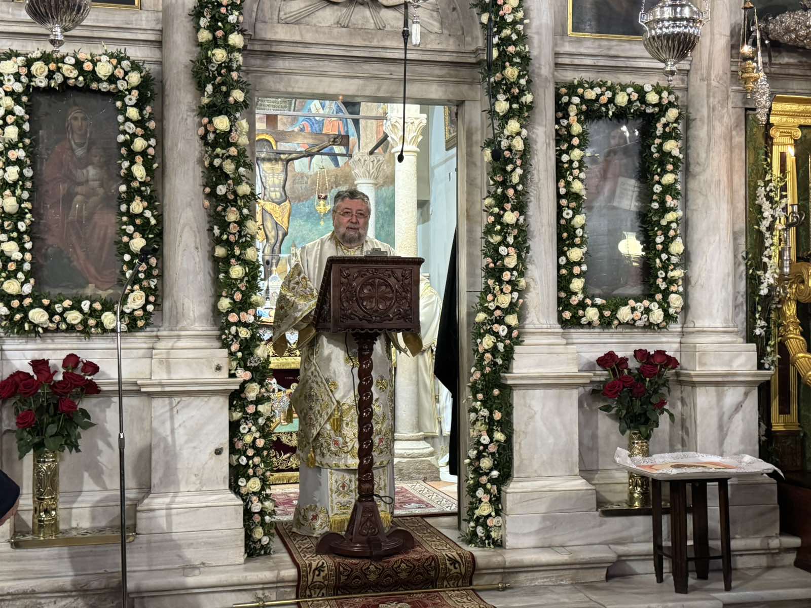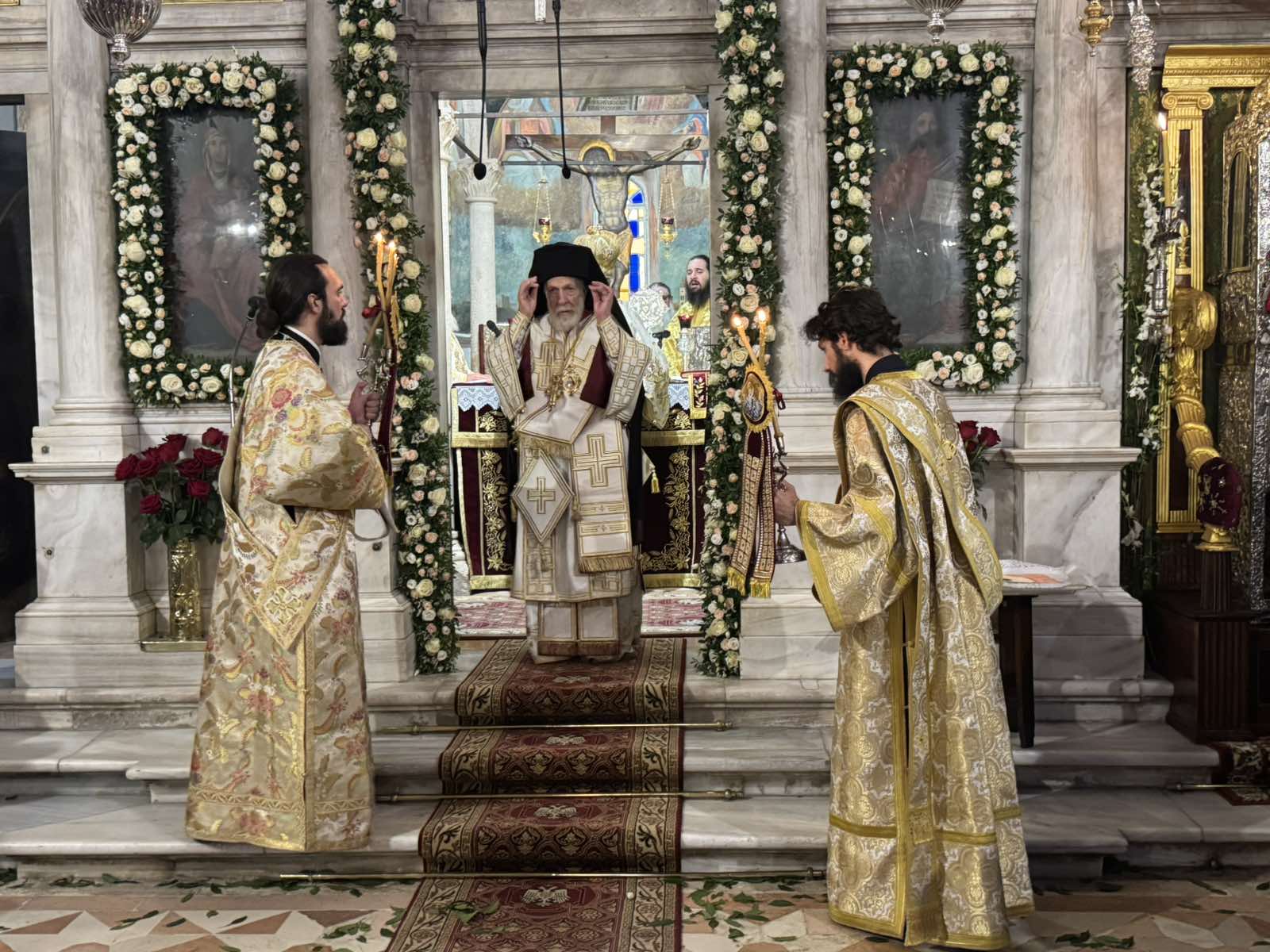 Σήμερα έχουμε μεγάλη χαρά, διότι υποδεχόμεθα δύο αδελφούς συνεπισκόπους και και συλλειτουργούμε μαζί τους, ως ο Άγιος επιθυμεί και η Εκκλησία ορίζει. Τον Σεβασμιώτατο Μητροπολίτη Γέροντα Πριγκηποννήσων κ. Δημήτριο και τον Σεβασμιώτατο Μητροπολίτη Φιλαδελφείας κ. Μελίτωνα. Και οι δύο έρχονται από την βασιλίδα των Πόλεων, την Μητέρα Εκκλησία της Κωνσταντινουπόλεως, το Οικουμενικό Πατριαρχείο. Εκεί ο Άγιος Σπυρίδων παρέμεινε επί σχεδόν 7 αιώνες, από τότε που μεταφέρθηκε το άφθαρτο σκήνωμά του εκ Κύπρου, για να μην περιπέσει εις χείρας αλλοτρίας, και έμεινε μέχρι την Άλωση της Πόλεως, για να έρθει σε εμάς, θησαύρισμα πολύτιμον και ανεκτίμητον.
