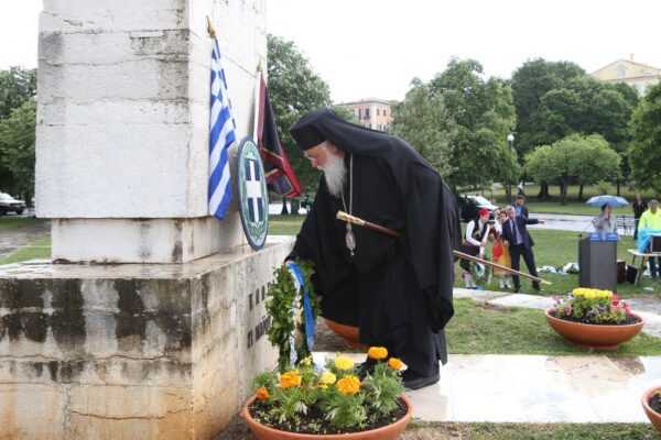 Κατόπιν ο κ. Νεκτάριος, παρά τις δυσμενείς καιρικές συνθήκες, τέλεσε επιμνημόσυνη δέηση στο Μνημείο της Ένωσης των Επτανήσων και κατέθεσε στεφάνι στην μνήμη του πρωτεργάτου της Ενώσεως, μακαριστού Μητροπολίτου Κερκύρας, Αθανασίου Πολίτου, ο τάφος του οποίου βρίσκεται στον ναό της Αγίας Τριάδος Γαρίτσας, και των αγωνιστών Κερκυραίων και άλλων Επτανησίων, παρουσία των αρχών της Κέρκυρας.