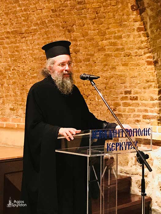 Τον Σεβασμιώτατο Μητροπολίτη Κερκύρας, Παξών και Διαποντίων Νήσων κ. Νεκτάριο, ο οποίος βρισκόταν στην Αθήνα για τις εργασίες της Ιεράς Συνόδου, εκπροσώπησε ο Πανοσιολ. Αρχιμ. Ιουστίνος Κωνσταντάς, Πρωτοσύγκελος της Ι.Μ. Κερκύρας, ο οποίος αφού μετέφερε τις πατρικές ευχές και την αγάπη του Σεβασμιωτάτου, καλωσόρισε στην Κέρκυρα τον κ. Καραμπελιά.