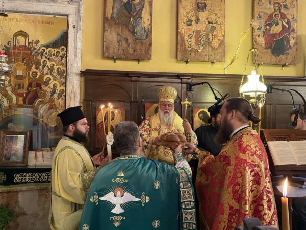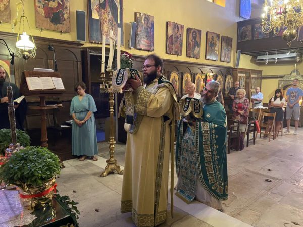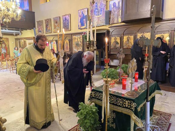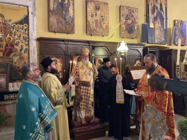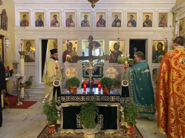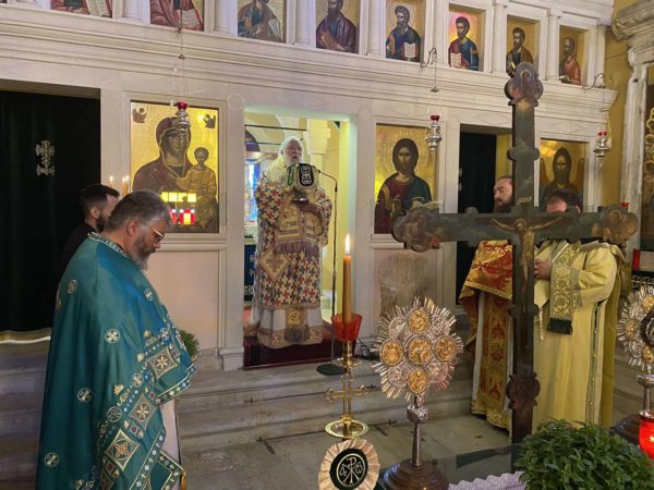 Στο τέλος της Θείας Λειτουργίας ο Μητροπολίτης τέλεσε την Ύψωση του Τιμίου Σταυρού προσφέροντας προς ασπασμό στους πιστούς. το Τίμιο Ξύλο και την ευλογία του βασιλικού.