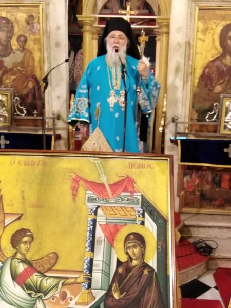 Απευθυνόμενος στους συλλειτουργούς, αλλά και σε όσους παρακολούθησαν την θεία λειτουργία διά μέσω της τηλεόρασης, του ραδιοφώνου και του διαδικτύου, ο κ. Νεκτάριος τόνισε ότι τίποτα δεν μπορεί να μας χωρίσει από την αγάπη του Χριστού, αρκεί να έχουμε πίστη και αγάπη. Ενώ όμως ο Χριστός μας ελευθέρωσε από την αμαρτία, την φθορά και τον θάνατο, εντούτοις βλέπουμε ότι και πάλι, ιδίως στην εποχή μας, έχουμε επιστρέψει στην κατάσταση της πτώσεως, λησμονώντας τον Θεό και τον συνάνθρωπο. Το επιτίμιο είναι σήμερα η απομάκρυνση από τον πλησίον, δεν είναι μόνο ο εγκλεισμός μας στα σπίτια μας. Είναι ένα είδος κολασμού η στέρηση του πλησίον. Δεν μπορούμε να χαρούμε την χαρά της ελευθερίας που ο Θεός μας χάρισε. Η Εκκλησία μας όμως συνεχίζει να εορτάζει και να πανηγυρίζει τον Ευαγγελισμό και προσεύχεται γιατί ο Χριστός δεν θα μας αφήσει. Παρότι παγιδευτήκαμε στην πλεονεξία, στο ίδιον θέλημα και απομονωθήκαμε, εντούτοις δεν θα νικηθούμε.