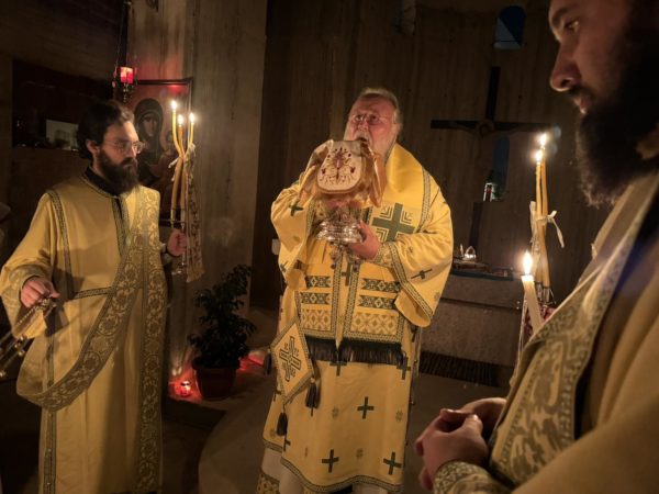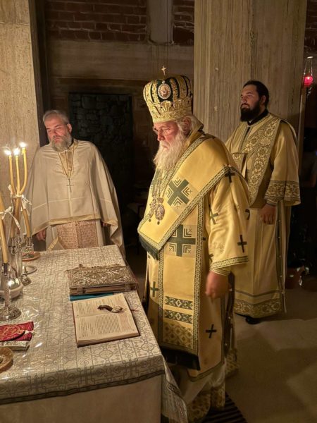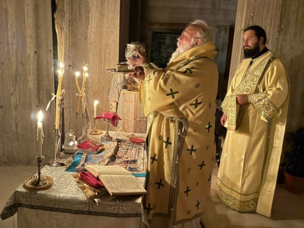 Ο Σεβασμιώτατος στο ιερό θυσιαστήριο πλαισιώθηκε από τους διακόνους του, και τον αρχηγό της γ΄ περιόδου, πρωτοπρεσβύτερο π. Γεώργιο Μπογδάνο.