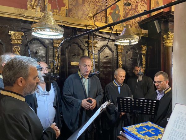Κατά την Θεία Λειτουργία ήτο κατάμεστος ο Ιερός Ναός από ευσεβείς χριστιανούς, ντόπιους και ξένους επισκέπτες του νησιού μας και έψαλε η ωραιότατη Χορωδία σε βυζαντινό ύφος τηρώντας την παράδοση του ως άνω Ιερού Ναού ο οποίος είναι δημιούργημα του 17ου αιώνα, όταν ήλθε κυρίως από την περιοχή της Ηπείρου εξαιτίας του τουρκικού ζυγού και των βίαιων εξισλαμισμών μεγάλος αριθμός ηπειρωτών, βρίσκοντας καταφύγιο στο νησί μας. Μετά την εγκατάστασή τους δημιούργησαν μεγάλη Αδελφότητα καθώς και τον εν λόγω Ιερό Ναό, ο οποίος έκτοτε συντηρεί την δική του ιδιαίτερη παράδοση. Χοράρχης είναι ο καθηγητής και Καλλιτεχνικός Διευθυντής της Σχολής Εκκλησιαστικής Μουσικής «Ο ΑΓΙΟΣ ΑΡΣΕΝΙΟΣ» της Ιεράς μας Μητροπόλεως κ. Νικόλαος Μακρόπουλος, ο οποίος πλαισιώνεται από μαθητές της σχολής και στο αριστερό αναλόγιο ο παλαιός ιεροψάλτης του Ιερού Ναού κ. Γεώργιος Τόμπρος, πτυχιούχος και γνώστης της βυζαντινής μουσικής.