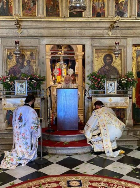 Μετά το πέρας της θείας λειτουργίας ακολούθησε ο εσπερινός της Γονυκλισίας και ο Σεβασμιώτατος ευχήθηκε το φώς του Παρακλήτου να φωτίζει τον κόσμο μας και να τον οδηγεί στην αλήθεια της πίστεως και της Εκκλησίας μας.